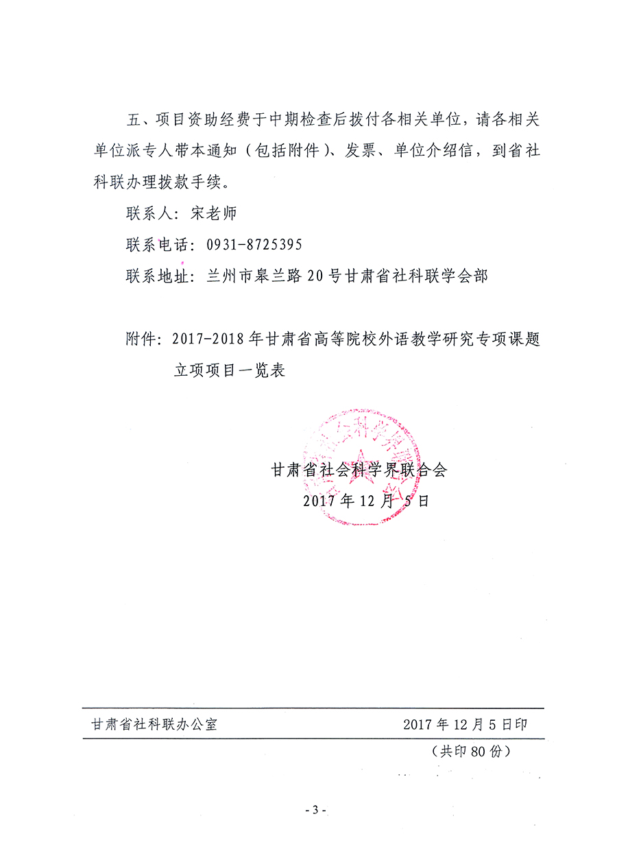 轉(zhuǎn)發(fā)甘肅省社科聯(lián)“關(guān)于2017-2018年甘肅省高等院校外語教學(xué)研究專項(xiàng)課題立項(xiàng)的通知”