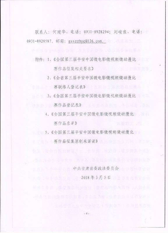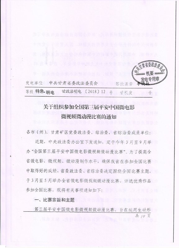 現(xiàn)將甘肅省教育廳關(guān)于轉(zhuǎn)發(fā)《省委政法委<關(guān)于組織參加全國(guó)第三屆平安中國(guó)微電影微視頻微動(dòng)漫比賽的通知>》(甘政法明電〔2018〕12號(hào))轉(zhuǎn)發(fā)你們,請(qǐng)各部門(mén)、單位根據(jù)要求廣泛動(dòng)員,積極參與。將參賽作品存儲(chǔ)在移動(dòng)硬盤(pán)或數(shù)碼U盤(pán)中,于5月10日前報(bào)宣傳統(tǒng)戰(zhàn)部辦公室,宣傳統(tǒng)戰(zhàn)部對(duì)報(bào)送作品匯總后統(tǒng)一報(bào)送省教育廳。