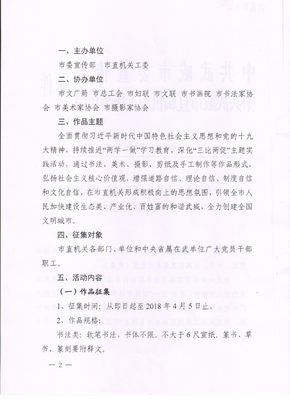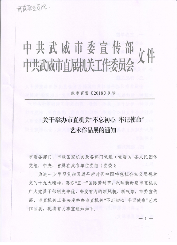 現(xiàn)將中共武威市委宣傳部、中共武威市直屬機關工作委員會《關于舉辦市直機關“不忘初心? 牢記使命”藝術作品展的通知》(武市直發(fā)〔2018〕9號)轉發(fā)你們,請各部門、單位根據(jù)要求認真組織,積極參與。將參賽作品于4月2日前報宣傳統(tǒng)戰(zhàn)部辦公室,宣傳統(tǒng)戰(zhàn)部對報送作品匯總后統(tǒng)一報送市直屬機關工委。