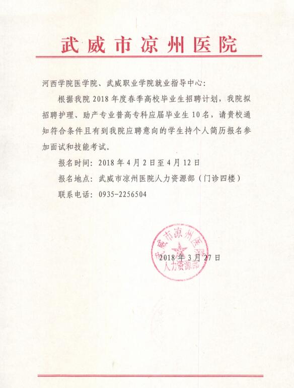 ? ? ? ?武威市涼州醫(yī)院擬招聘護(hù)理、助產(chǎn)專(zhuān)業(yè)畢業(yè)生10名,報(bào)名時(shí)間2018年4月2日~4月12日,報(bào)名時(shí)請(qǐng)攜帶個(gè)人簡(jiǎn)歷,一寸彩色照片一張,請(qǐng)我系15級(jí)應(yīng)屆畢業(yè)生積極響應(yīng),踴躍報(bào)名!