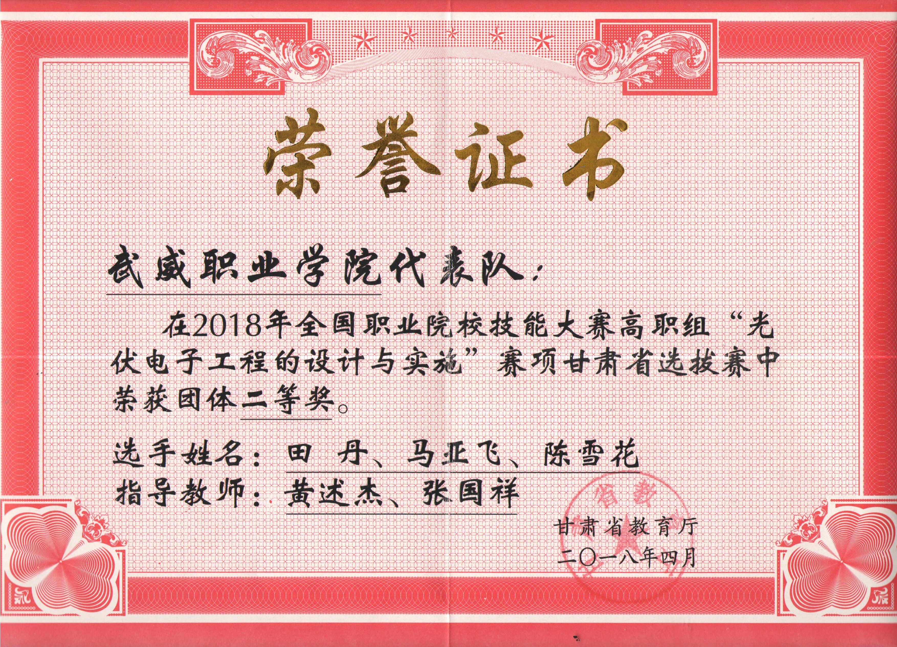 4月14日,2018年全國職業(yè)院校技能大賽“光伏電子工程的設(shè)計與實(shí)施”賽項(xiàng)甘肅省選拔賽在甘肅林業(yè)職業(yè)技術(shù)學(xué)院舉行。此次大賽有蘭州石化職業(yè)技術(shù)學(xué)院、甘肅林業(yè)職業(yè)技術(shù)學(xué)院、武威職業(yè)學(xué)院等6所院校的11支代表隊(duì)33名選手參加。由我院能源工程系黃述杰、張國祥老師指導(dǎo),田丹、馬亞飛、陳雪花三名學(xué)生組成的武威職業(yè)學(xué)院一隊(duì)榮獲二等獎。