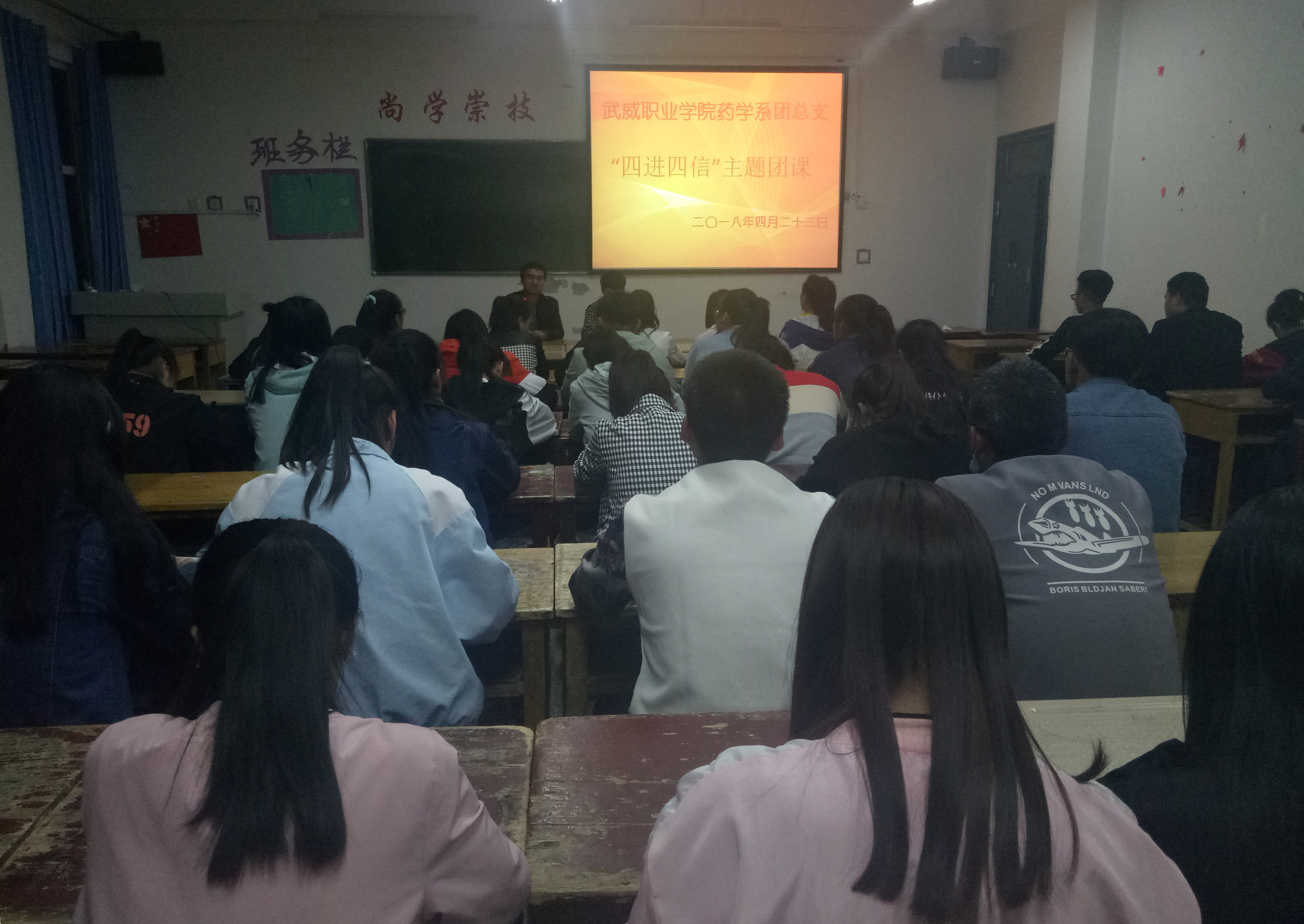 為深入學習宣傳貫徹習近平新時代中國特色社會主義思想,堅持以習近平新時代中國特色社會主義思想武裝團員干部和團員青年學生頭腦,積極推進各項工作開展。2018年4月23日晚,藥學系團總支組織16級團員青年及17級入團積極分子在明遠樓501教室開展關于“四進四信”的主題團課活動,團課由要藥學系團總支書記陳輝生主持。