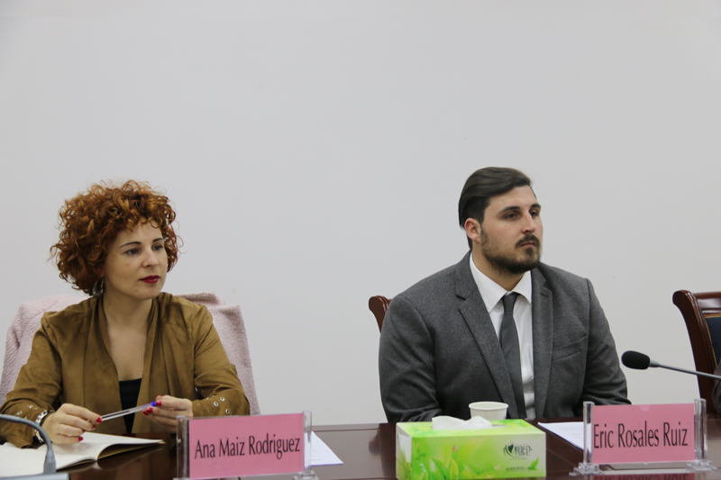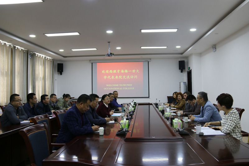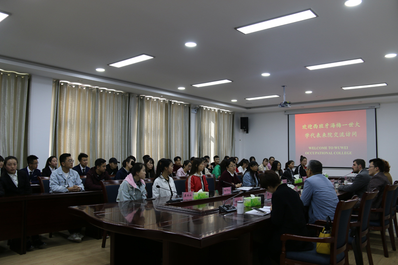 座談會上,田迎春代表全院師生對海梅一世大學到訪學院表示歡迎,對省國際交流與合作服務(wù)中心對學院的關(guān)心表示感謝,并向來訪客人簡要介紹了武威文化歷史、學院建設(shè)發(fā)展情況、學院國際交流與合作開展情況。來訪客人對學院近年來的巨大發(fā)展表示贊賞,對學院國際交流與合作開展工作表示肯定。Ana女士通過PPT展示介紹了海梅一世大學,希望雙方進一步進行合作。賓主雙方還就校際交流、語言培訓、赴西班牙專升碩留學項目等共同關(guān)心的問題進行了深入交流。