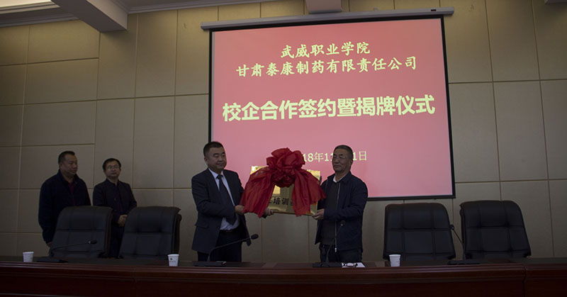為提高人才培養(yǎng)質(zhì)量和辦學水平,加強校企協(xié)同育人機制建設,11月1日下午,藥學系與甘肅泰康制藥有限責任公司校企合作共建“就業(yè)實習基地”簽約揭牌儀式在行樹樓北側(cè)會議室隆重舉行。甘肅泰康制藥有限責任公司投資方—北京久朝集團產(chǎn)業(yè)中心總監(jiān)楊宏超、公司總工程師毛著鴻、財務總監(jiān)郝敏等企業(yè)領導出席本次儀式。學院教務處處長仲生仁、招生就業(yè)處處長蔡柱山、藥學系主任魏潤明、副主任楊建美、黨總支副書記單光年及藥學系160余名師生參加了此次簽約揭牌儀式。儀式由魏潤明主持。