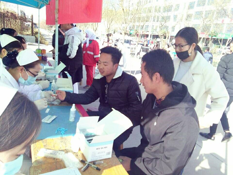 11月17日開始利用周末時間在武威文化廣場、武威職業(yè)學院門口等地開展了免費檢測艾滋病與知艾防艾知識宣傳活動?;顒游藦V大師生及路人,組織井然有序,活動場面顯得忙而不亂。在護理系紅絲帶協(xié)會志愿者與武威市疾控中心人員嫻熟的操作下,通過指尖采血,HIV病毒膠體金法檢測,共檢測了80余人,檢測速度快,精準度高。檢測結(jié)束后,向檢測者贈送活動宣傳紀念品。此次檢測活動采取保密制,保護檢測者的一切信息。