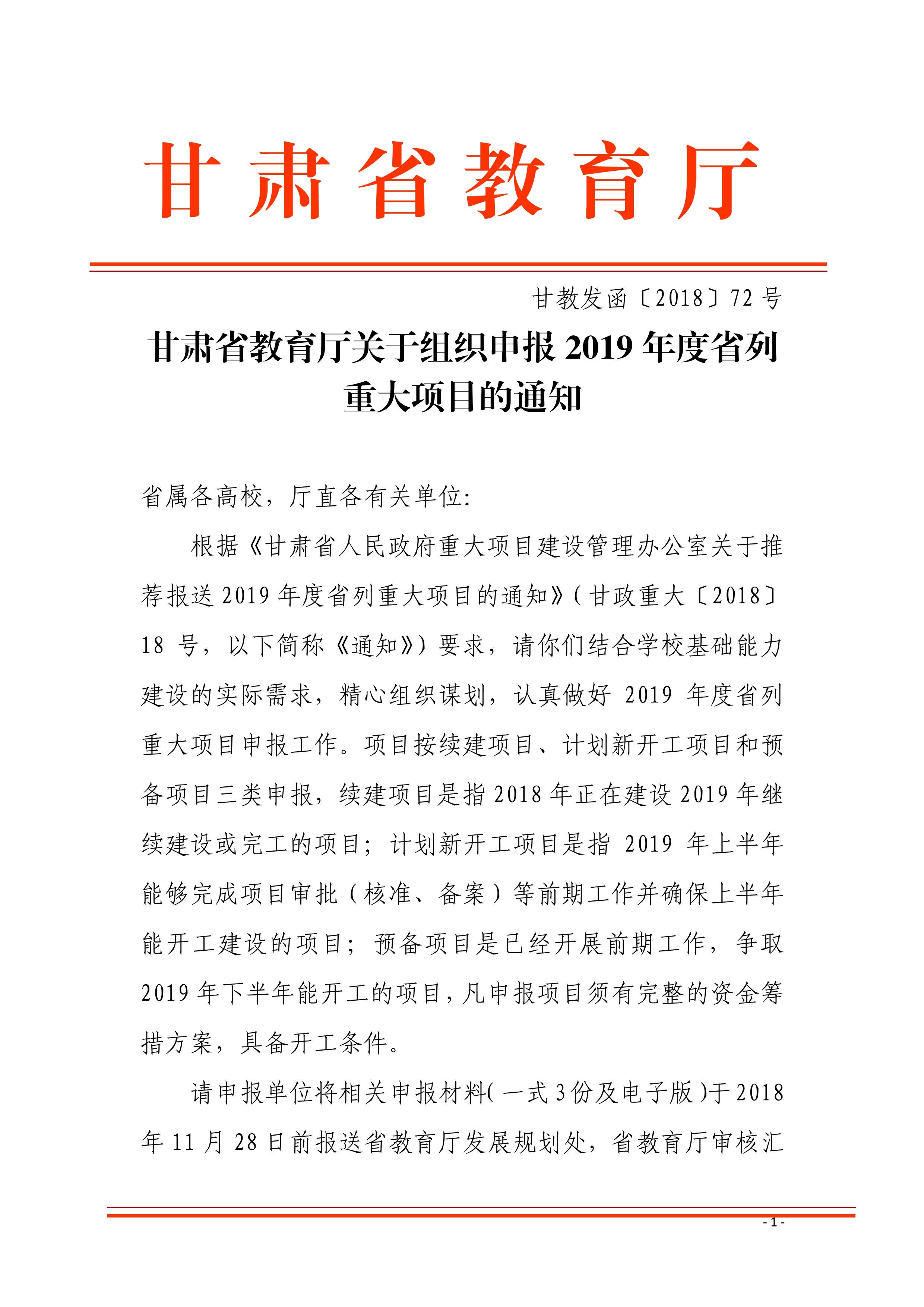 轉(zhuǎn)發(fā)甘肅省教育廳關(guān)于組織申報(bào)2019年度省列重大項(xiàng)目的通知