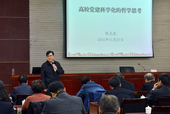 陳克恭在題為《高校黨建科學化的哲學思考》的講座中,以其獨特視角通過回顧中國近代史,闡明了中國共產(chǎn)黨執(zhí)政的客觀實在性。他認為,要用中國智慧、中國思維把馬克思主義和西方科學有機統(tǒng)一起來,構(gòu)建具有中國特色、中國風格、中國氣派的哲學社會科學體系。并以西北師大為例,就大學治理體系的現(xiàn)代化提出了自己的思考。