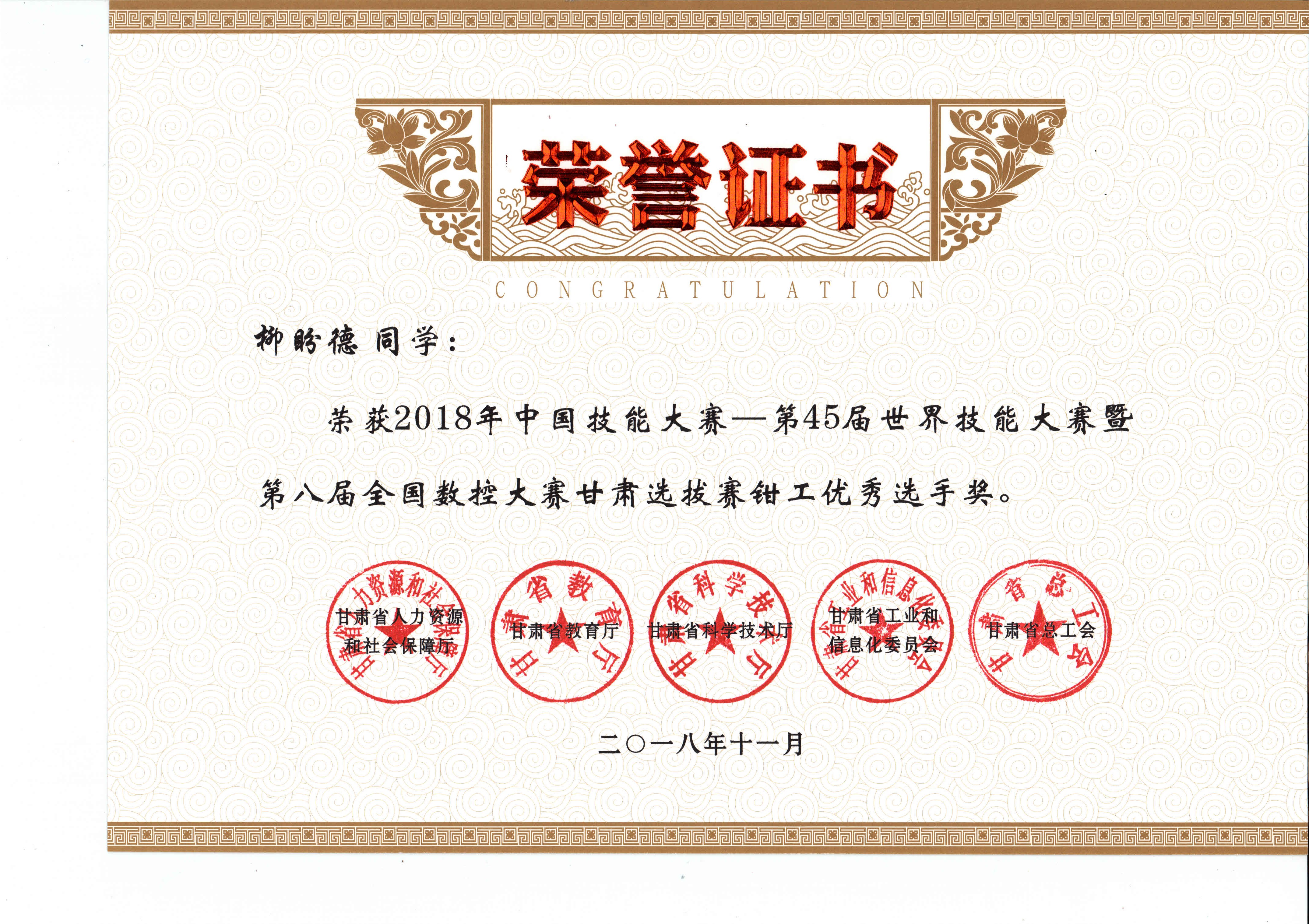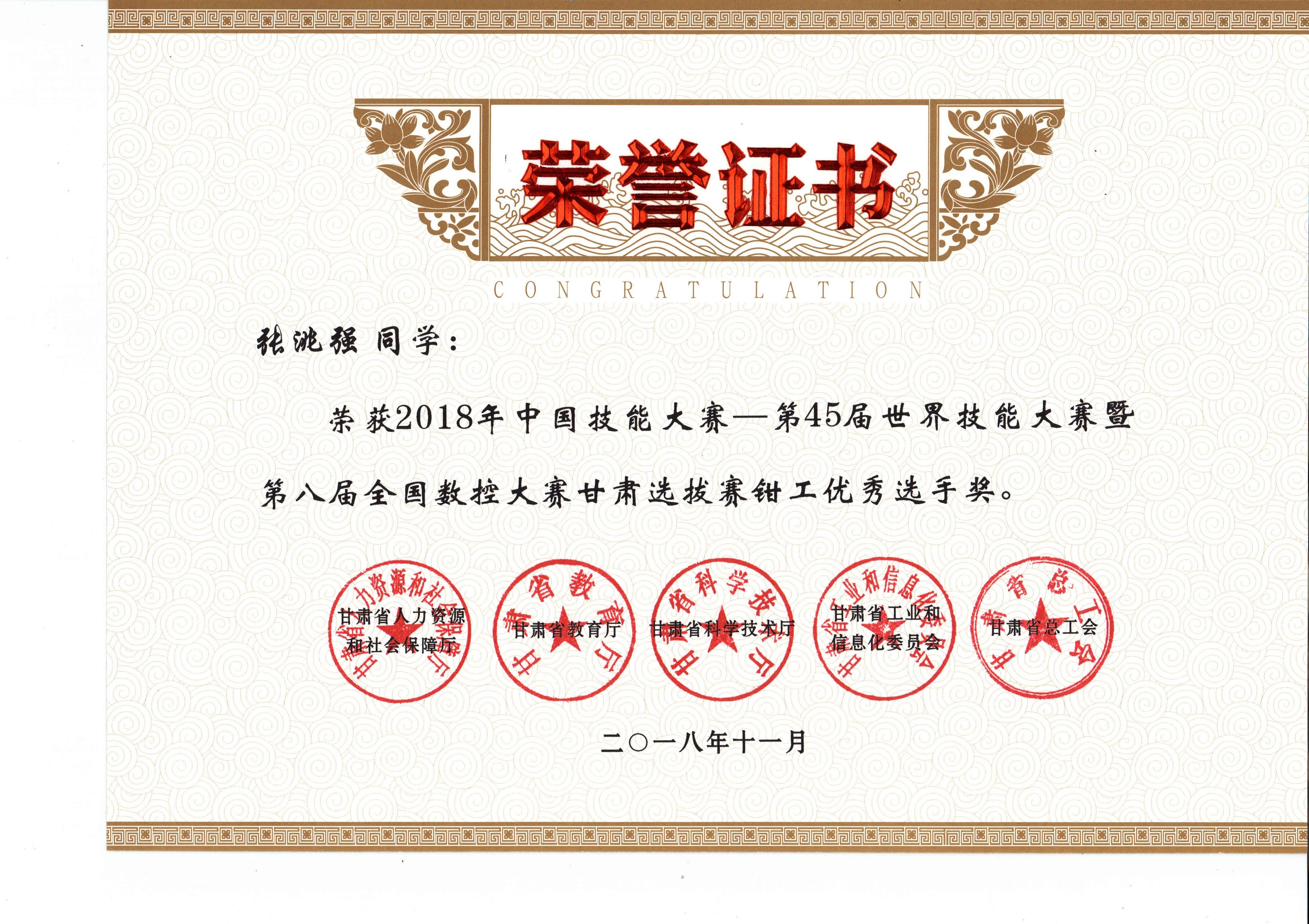 2018年中國技能大賽--第45屆世界技能大賽暨第八屆全國數(shù)控大賽甘肅選拔賽(鉗工項目)獲獎證書