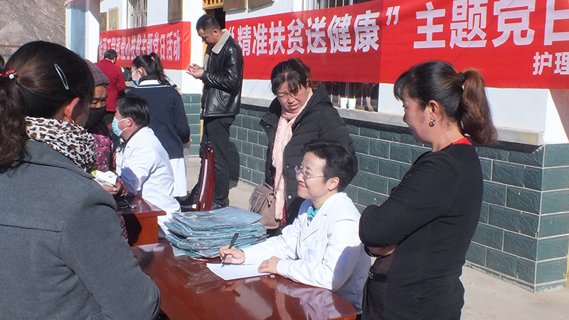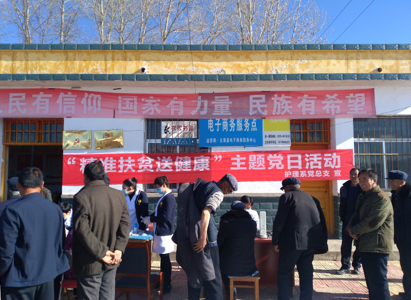 為深入學(xué)習(xí)宣傳貫徹黨的十九大精神及健康扶貧等惠民政策,減少出現(xiàn)“因病致貧”、“因病返貧”,11月23日,護(hù)理系黨總支組織黨員教師到我院精準(zhǔn)扶貧點(diǎn)古浪縣黑松驛鎮(zhèn)尚家臺(tái)村開(kāi)展“健康扶貧,送醫(yī)送藥”主題黨日活動(dòng)。