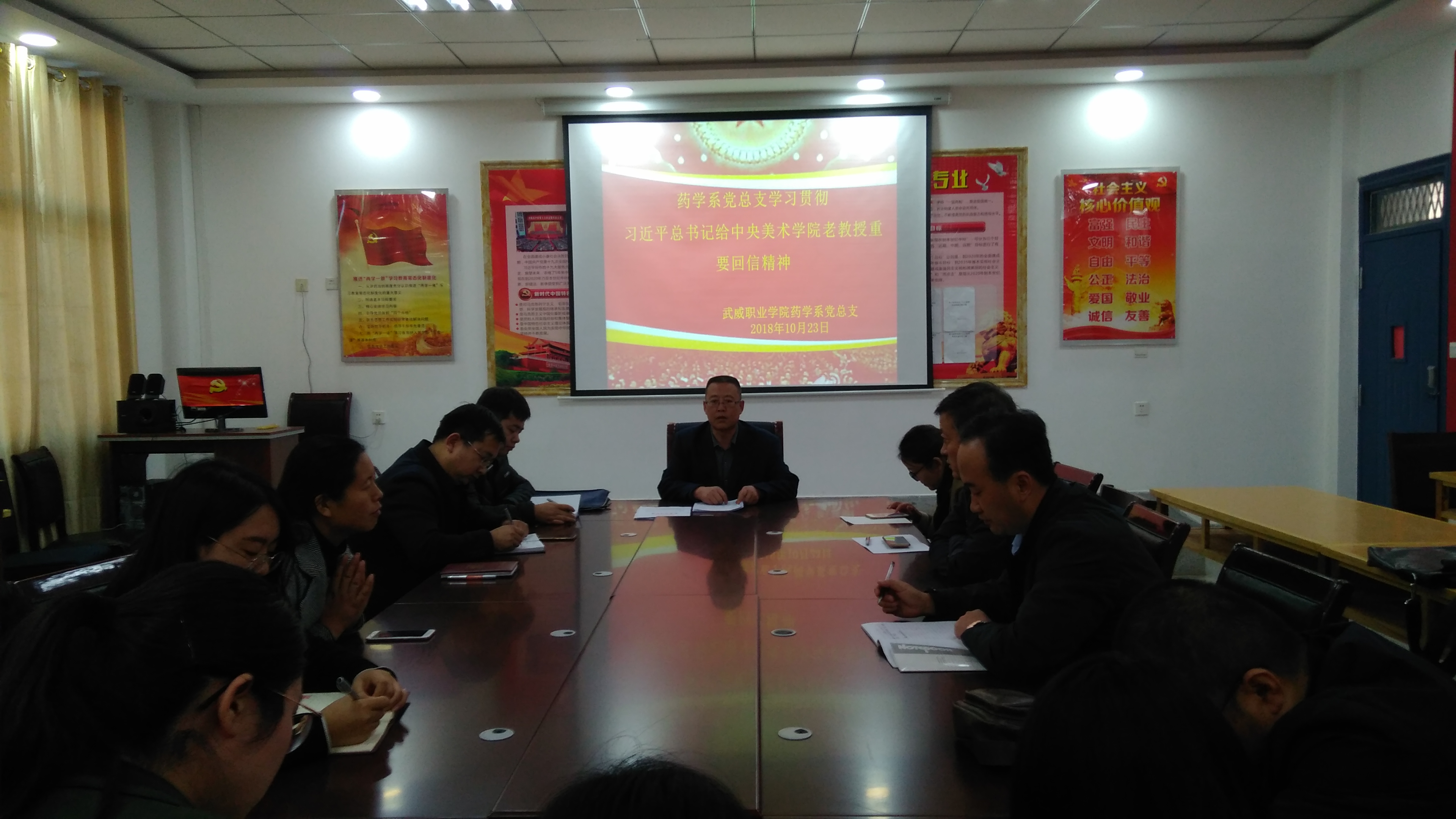 10月23日下午,藥學系組織全體教師在明遠樓103黨員活動室召開學習貫徹習近平總書記給中央美術學院老教授重要回信精神專題會議,會議由系主任魏潤明主持。