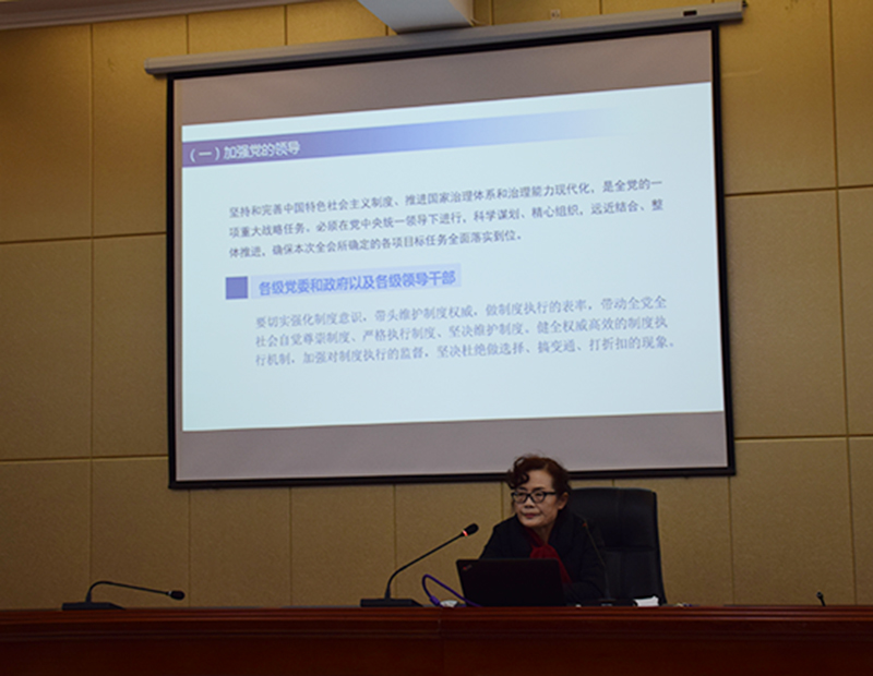 晏素珍以《中共中央關(guān)于堅持和完善中國特色社會主義制度推進(jìn)國家治理體系和治理能力現(xiàn)代化若干重大問題的決定》的學(xué)習(xí)與解讀為題,重點(diǎn)就全會召開的背景、意義和看點(diǎn);《決定》的基本框架和主要內(nèi)容以及抓好全會的學(xué)習(xí)貫徹的具體要求進(jìn)行了宣講。要求廣大師生提高政治站位,樹牢“四個意識”,堅定“四個自信”,做到“兩個維護(hù)”,推動全會精神在全系落地生根、取得扎實(shí)成效。為實(shí)現(xiàn)“兩個一百年”奮斗目標(biāo),實(shí)現(xiàn)中華民族偉大復(fù)興的中國夢而努力奮斗。