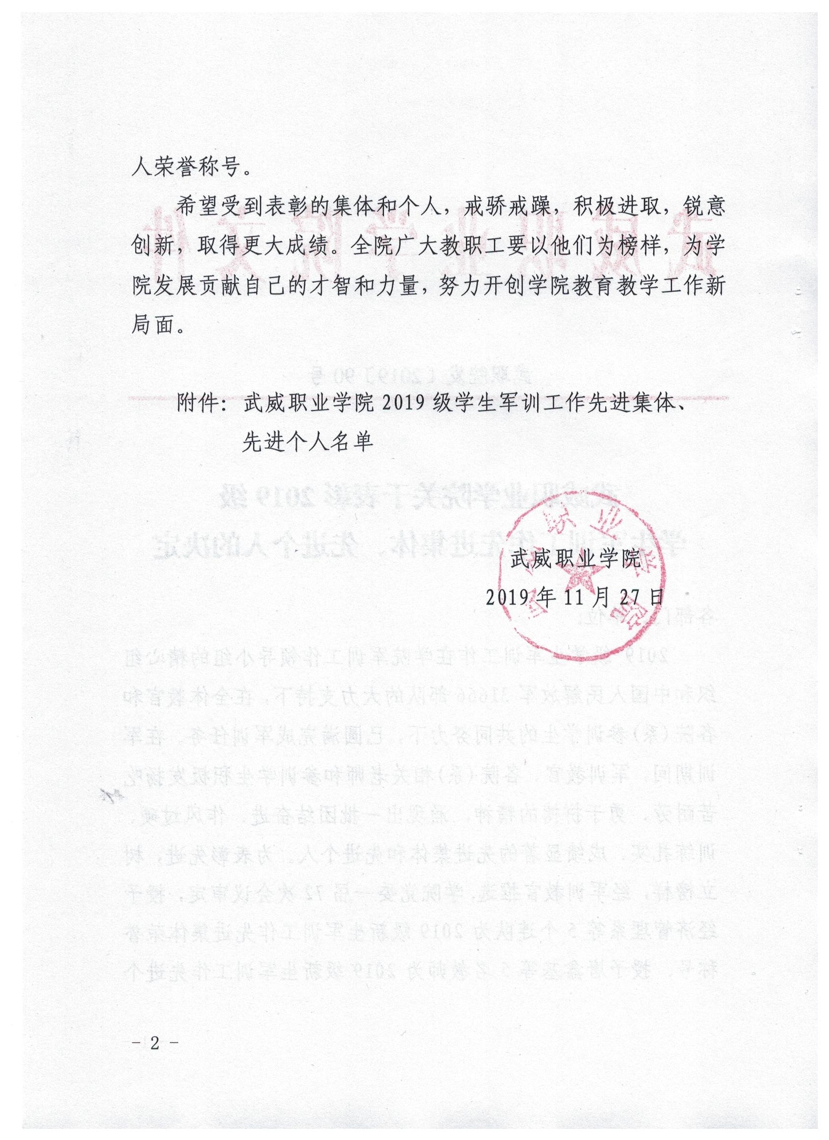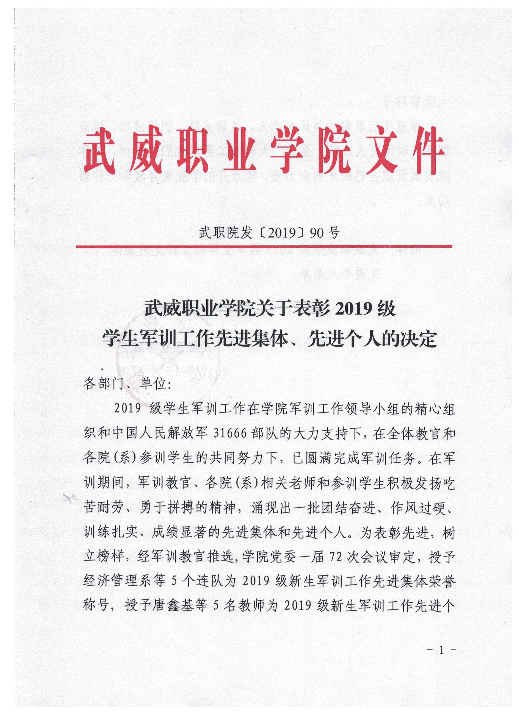 武威職業(yè)學(xué)院關(guān)于表彰2019級學(xué)生軍訓(xùn)工作先進集體、先進個人的決定