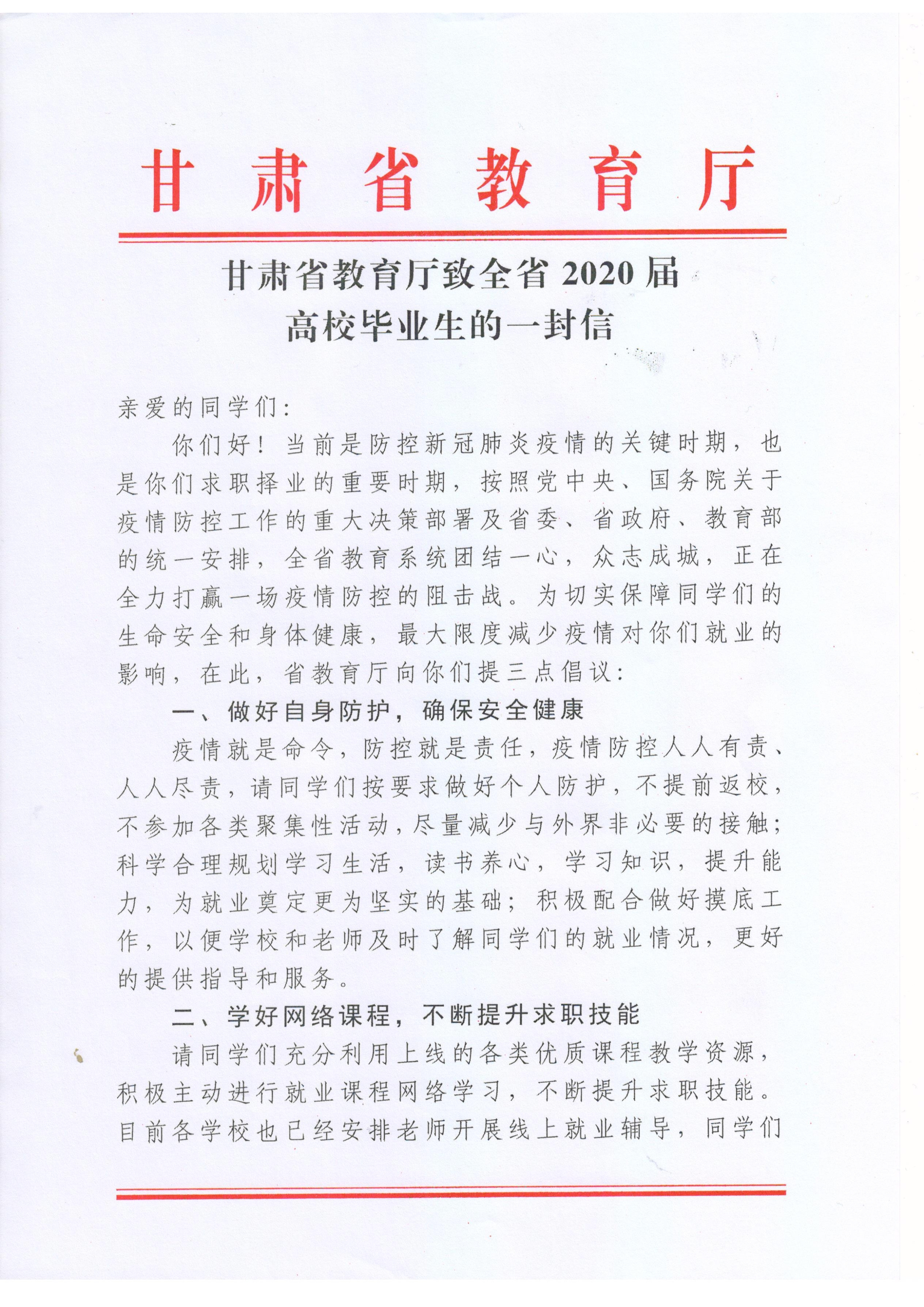 甘肅省教育廳致全省2020屆高校畢業(yè)生的一封信