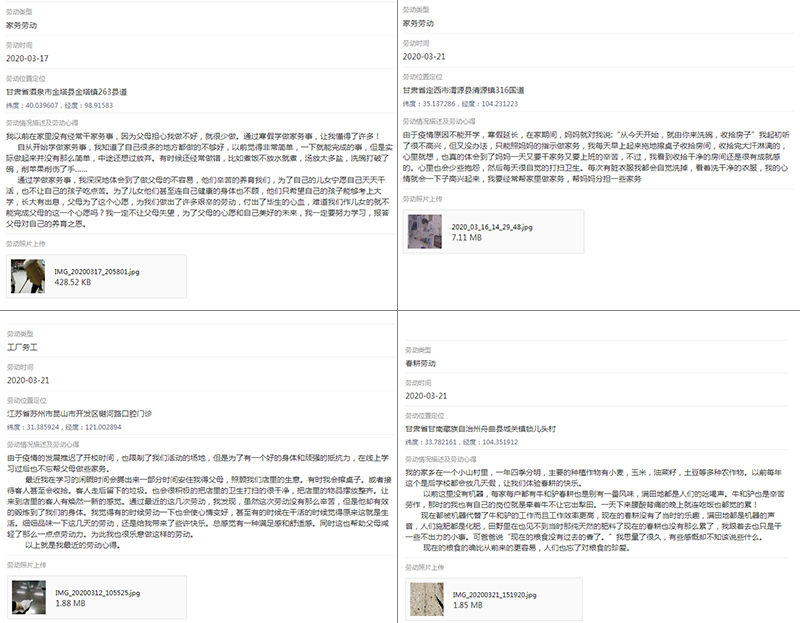 結合同學們生活和學習實際,學工處要求廣大同學積極參與志愿服務、春耕勞動、工廠務工、家務勞動等方面勞動實踐,完成每周不少于2小時的實踐鍛煉,并通過信息化平臺上報活動照片和勞動心得。