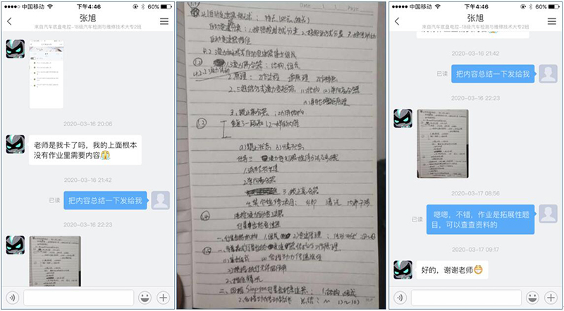 機械制造系和電信系的教師在課后積極收集學生的提問或者疑難問題,利用課余或周末的時間,在家中通過白板講解、紙筆講解的方式利用釘釘群直播講解練習題,開展互動答疑。