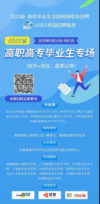 為了進(jìn)一步促進(jìn)2020屆高職高專畢業(yè)生就業(yè),教育部高校學(xué)生司和職業(yè)教育與成人教育司聯(lián)合推出“高職高專畢業(yè)生專場招聘會”,首批推出崗位超過50萬個。畢業(yè)生可登錄教育部大學(xué)生就業(yè)網(wǎng)(新職業(yè)網(wǎng)www.ncss.cn)或直接掃描宣傳頁中的二維碼參與活動。