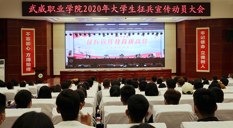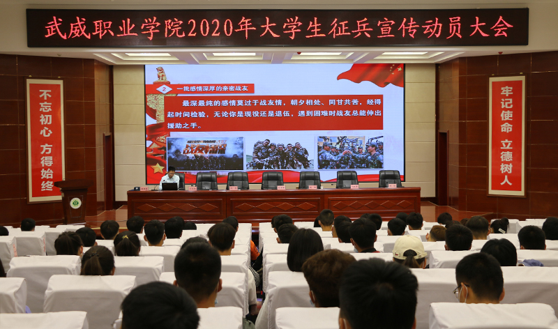6月10日上午,學(xué)院2020年大學(xué)生征兵宣傳動(dòng)員大會(huì)在菁英廳舉行。武威軍分區(qū)司令員張國輝、武威軍分區(qū)動(dòng)員處處長劉忠、涼州區(qū)人武部部長闞延貴、涼州區(qū)人武部政委丁俊強(qiáng),學(xué)院黨委書記、院長趙明,副院長何毅出席會(huì)議。各院系負(fù)責(zé)人、輔導(dǎo)員和學(xué)生代表共200人參加了會(huì)議。會(huì)議由副院長王守云主持。