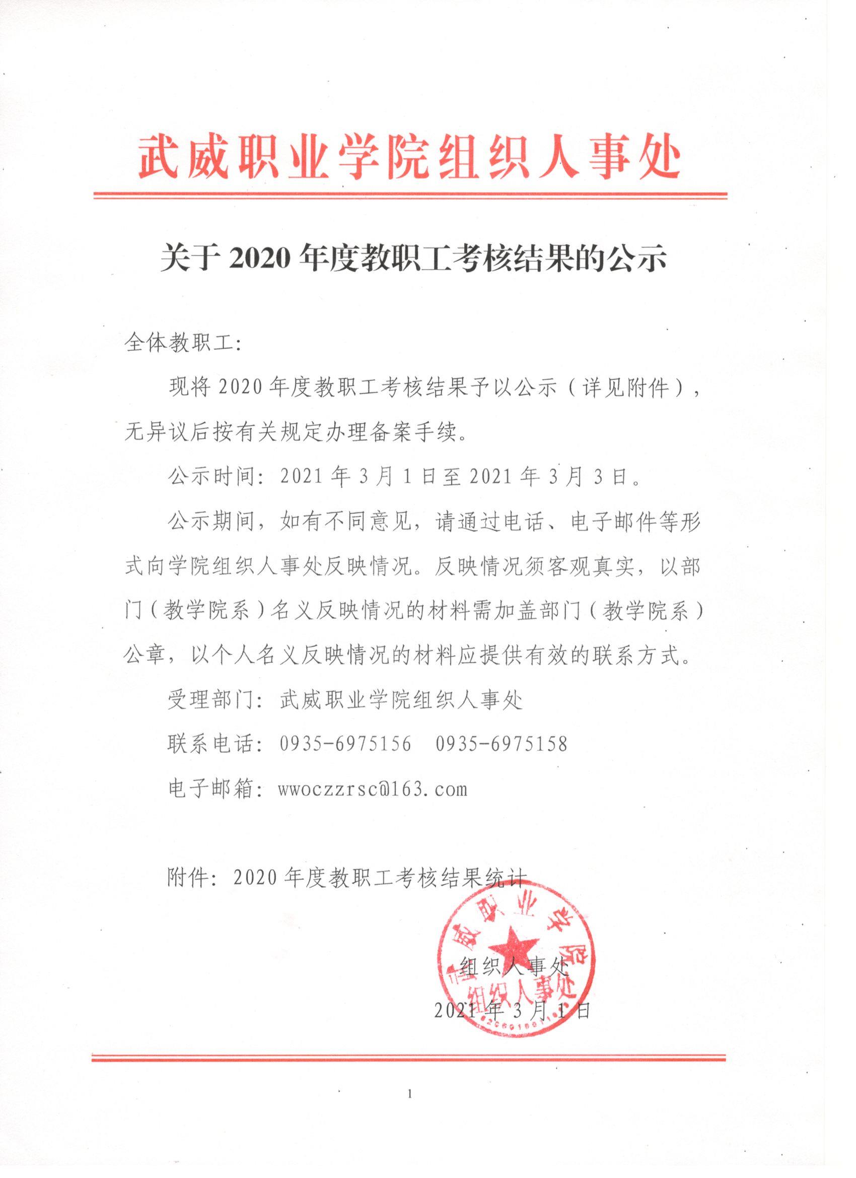 關(guān)于2020年度教職工考核結(jié)果的公示