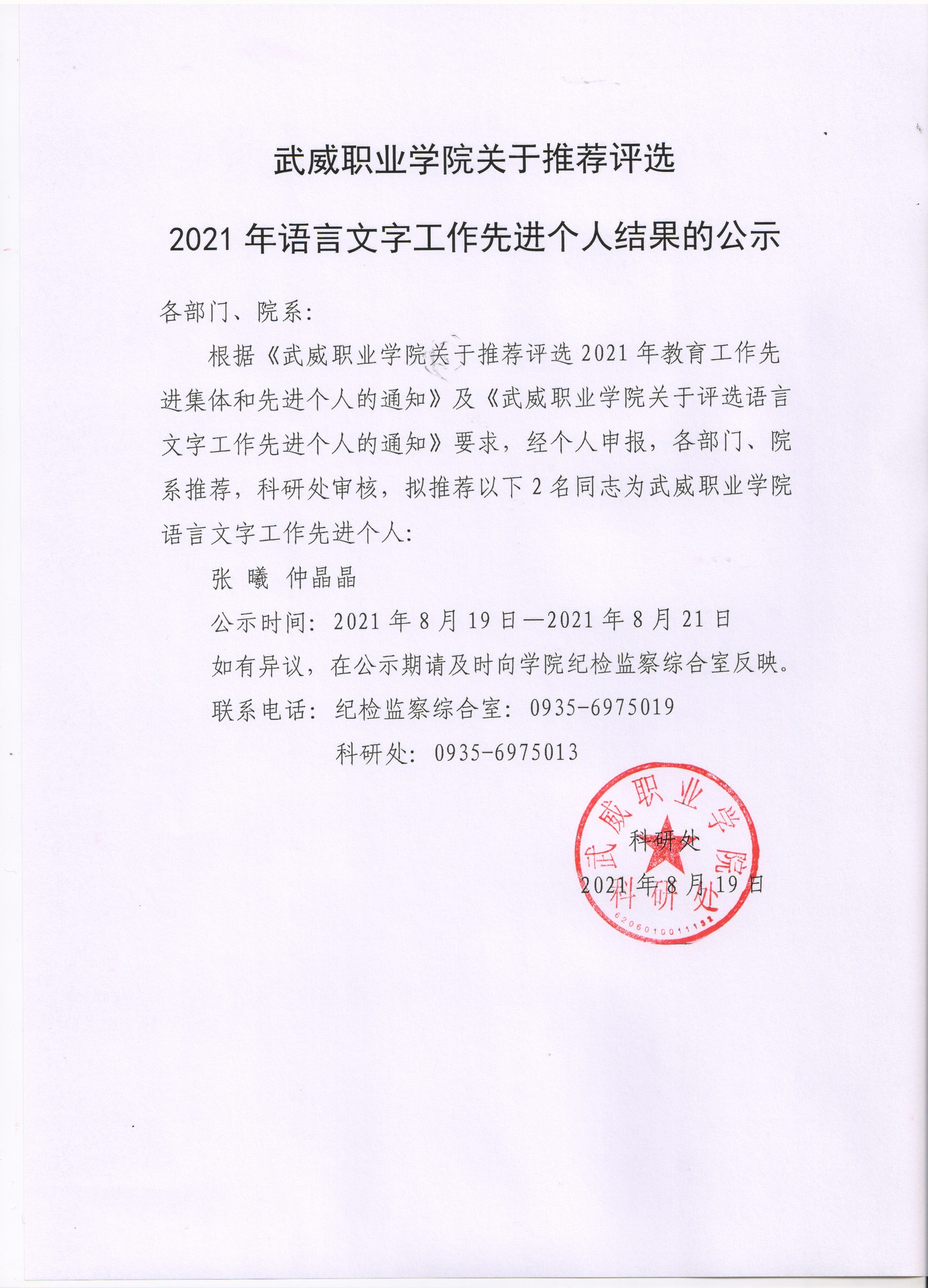 武威職業(yè)學院關于推薦評選2021年語言文字工作先進個人結果的公示