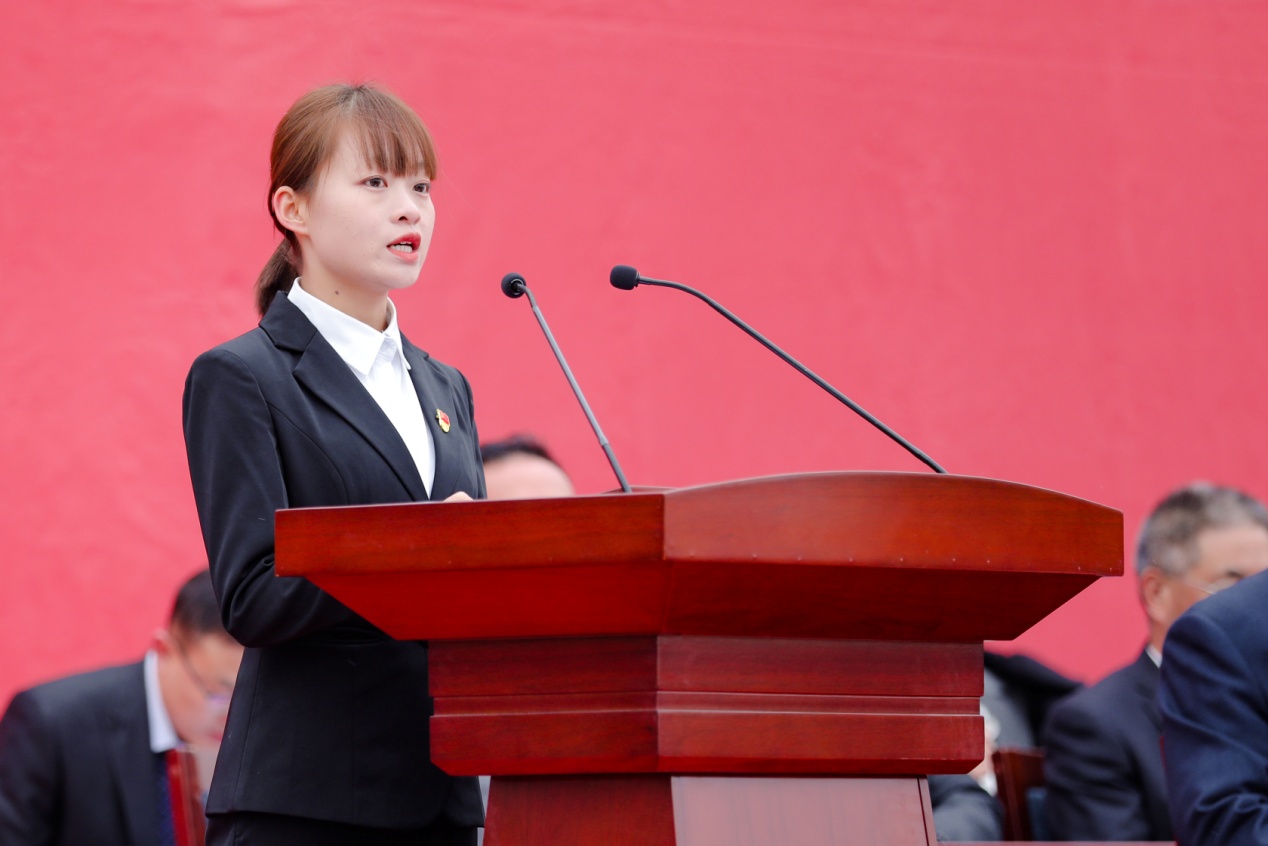 上午9時,大會在莊嚴的國歌聲中拉開序幕,二十余名學(xué)生代表致獻詞《請黨放心,強國有我》,用最飽滿的聲音,堅定地向黨道出了青春的誓言。