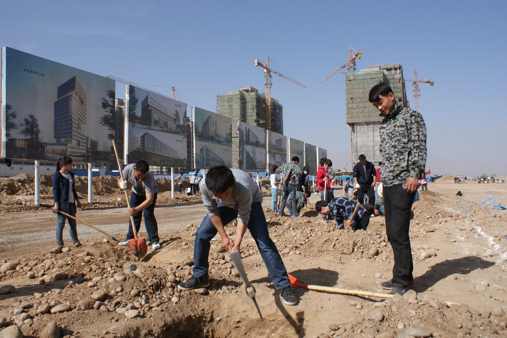 植樹現(xiàn)場(chǎng)一派忙碌的景象,大家有秩序地領(lǐng)取工具,三五一組,分工明確,揮動(dòng)鎬頭,掘土挖坑,再將一顆顆樹苗埋窩、培土、踩實(shí)、澆灌。經(jīng)過三天的緊張勞作,我系師生在指定區(qū)域完成了280個(gè)樹坑的開挖和樹木栽植任務(wù)。