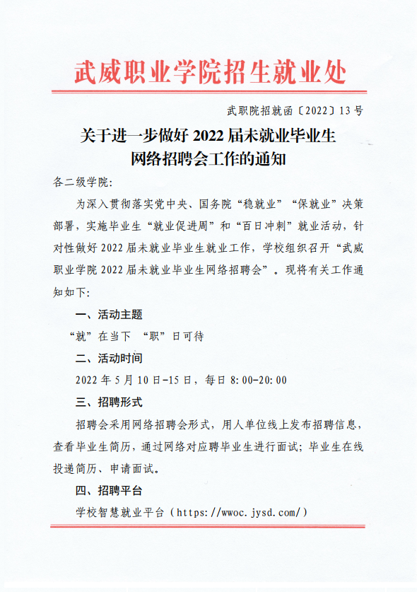 武威職業(yè)學(xué)院2022屆未就業(yè)畢業(yè)生就業(yè)促進(jìn)周暨網(wǎng)絡(luò)招聘會邀請函