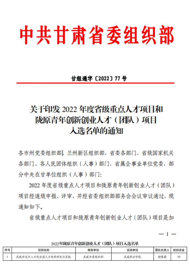 近日,省委組織部公布了2022年度省級(jí)重點(diǎn)人才項(xiàng)目和隴原青年創(chuàng)新創(chuàng)業(yè)人才(團(tuán)隊(duì))項(xiàng)目入選名單,我校顏魯薪老師主持的《武威市返鄉(xiāng)入鄉(xiāng)創(chuàng)業(yè)園人才培養(yǎng)研究與實(shí)踐》獲隴原青年創(chuàng)新創(chuàng)業(yè)人才(團(tuán)隊(duì))項(xiàng)目立項(xiàng)。