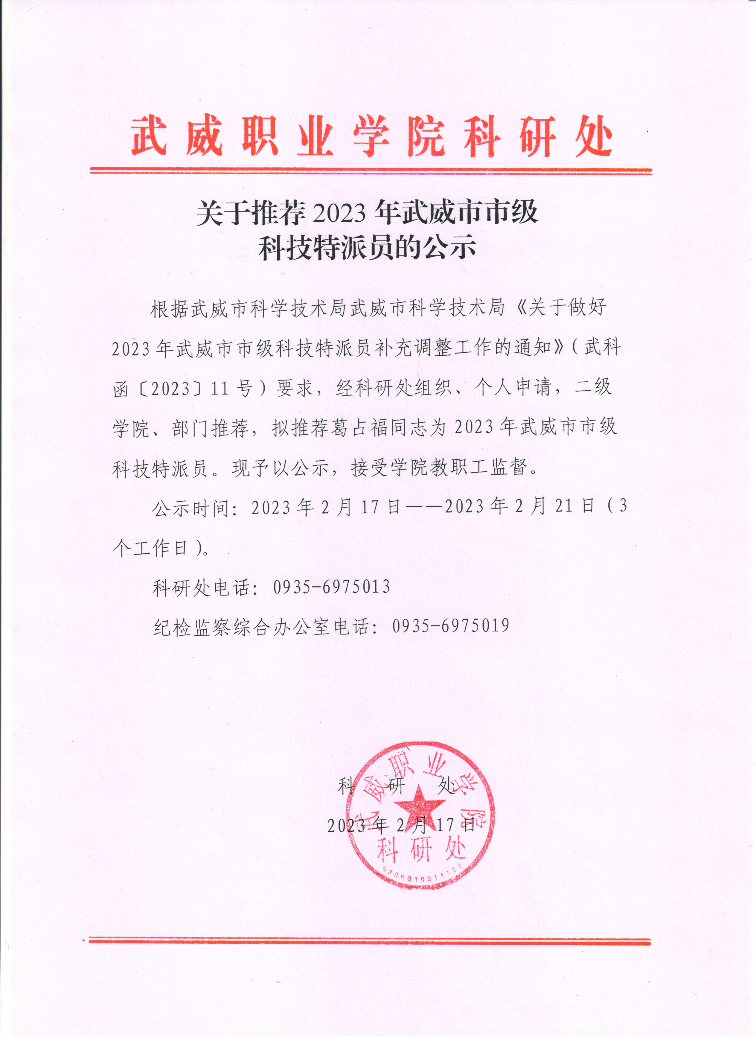 關于擬推薦2023年武威市市級科技特派員人員的公示