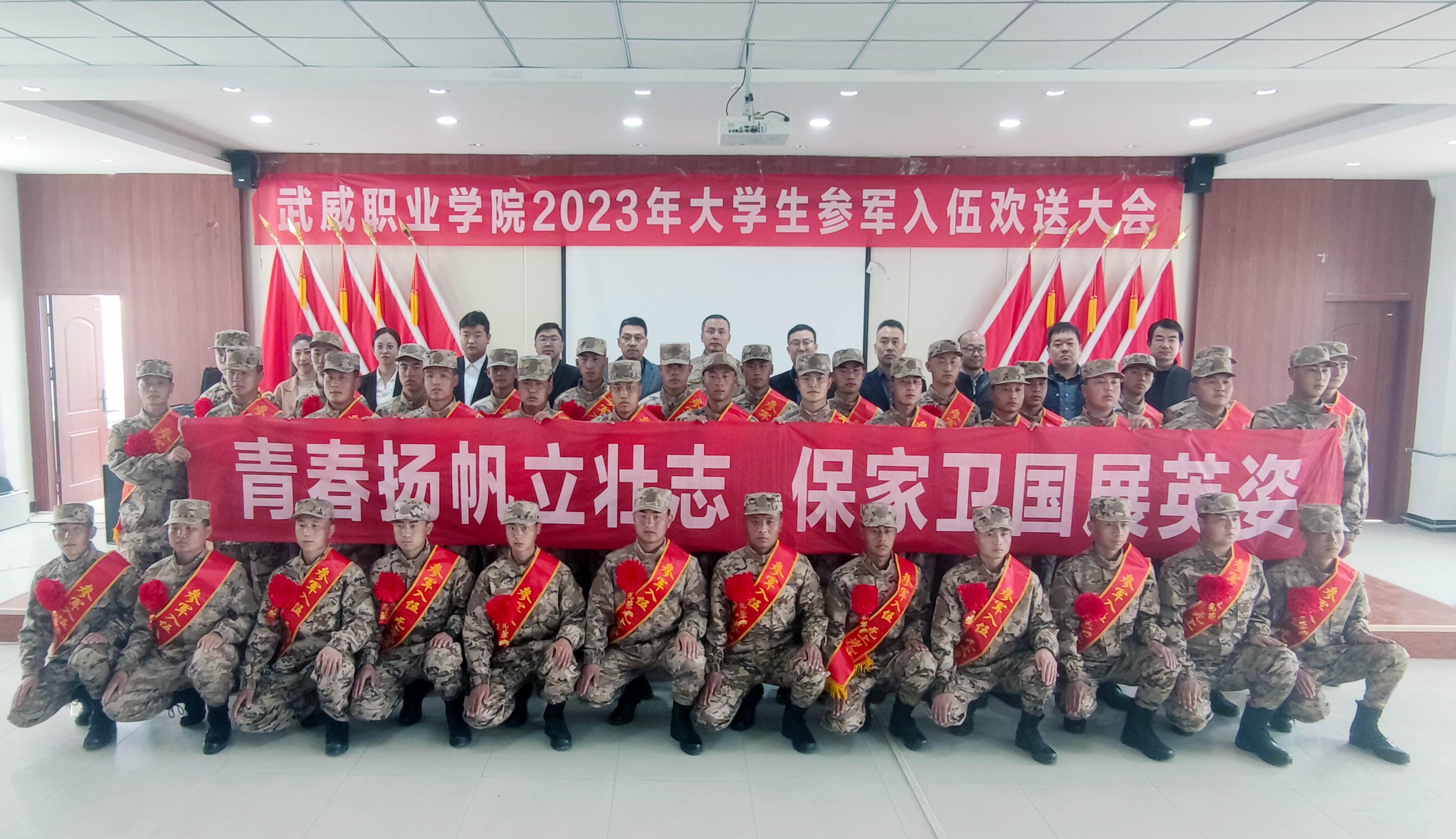 錚錚鐵骨正青春,參軍報國正當(dāng)時。3月15日,從學(xué)校報名入伍的31名大學(xué)生在武南役前教育訓(xùn)練基地整裝待發(fā),即將離開母校奔赴軍營,投身祖國最需要的地方。學(xué)校學(xué)生工作處(武裝部)、招生就業(yè)處負責(zé)人和各二級學(xué)院輔導(dǎo)員、班主任代表前往訓(xùn)練基地慰問歡送。涼州區(qū)人民武裝部上校部長金鑫受邀出席歡送大會并講話。