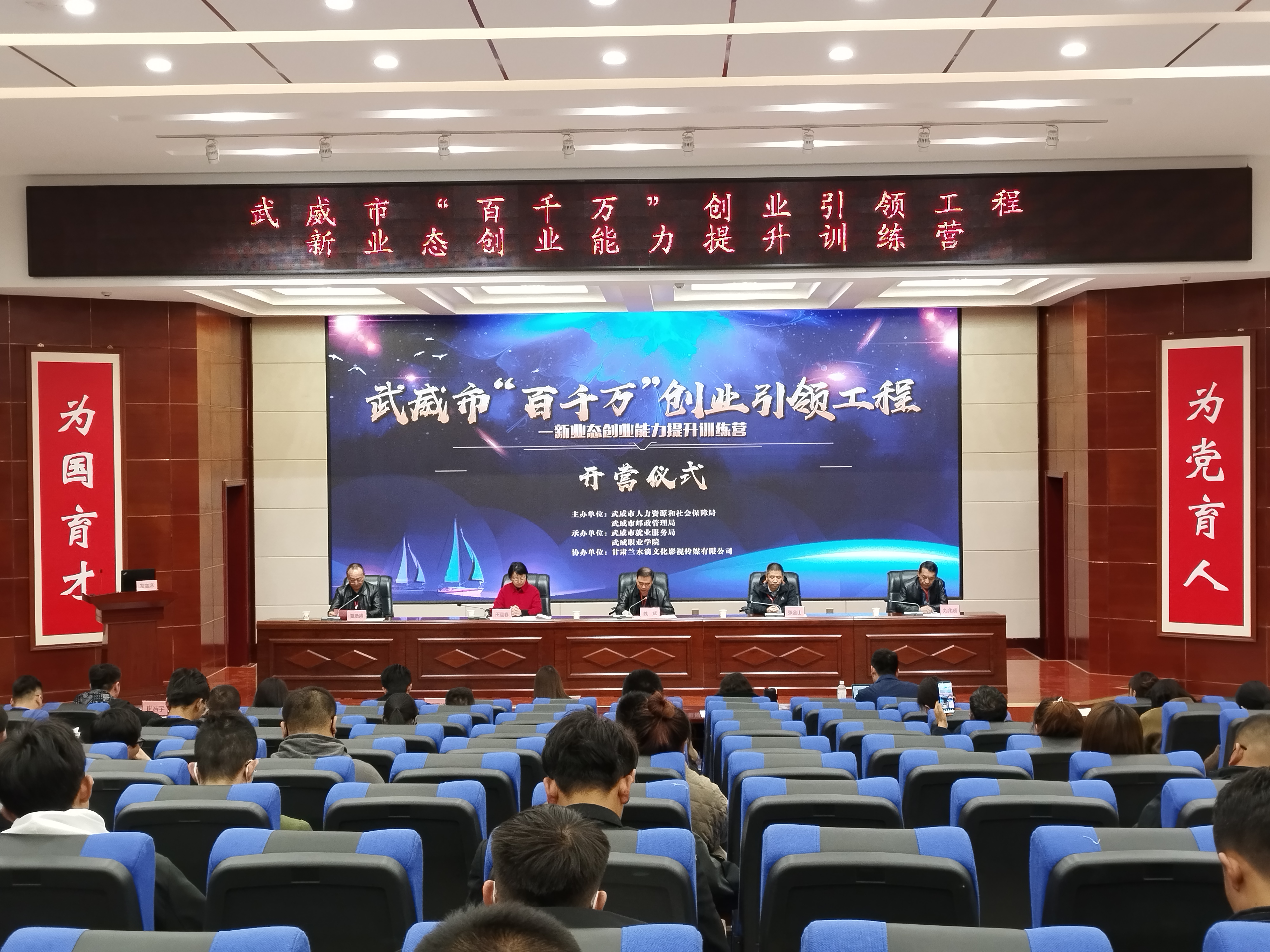 4月6日上午,由我校協(xié)辦的武威市“百千萬”創(chuàng)業(yè)引領(lǐng)工程新業(yè)態(tài)創(chuàng)業(yè)能力提升訓(xùn)練營(yíng)在菁英廳舉辦開營(yíng)儀式,武威市人社局黨組成員、就業(yè)局局長(zhǎng)魏斌,武威市郵政管理局黨組成員、副局長(zhǎng)張金山,武威市就業(yè)局副局長(zhǎng)劉兆順及副校長(zhǎng)田迎春出席開營(yíng)儀式,儀式由市就業(yè)局副局長(zhǎng)夏湧濤主持。