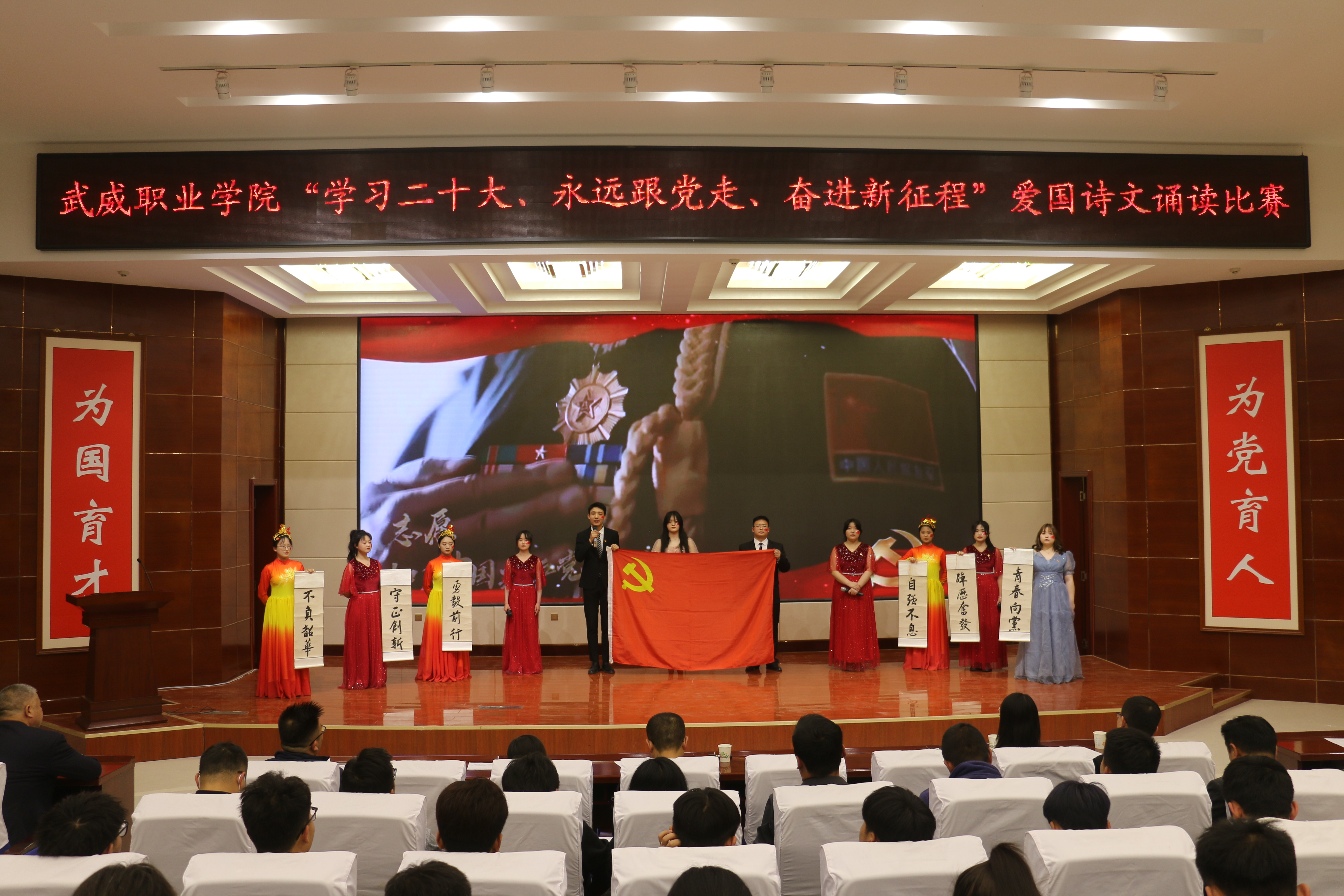 大賽于3月啟動,歷時一個月,各二級學(xué)院經(jīng)過初賽評比推選出9個優(yōu)秀節(jié)目入圍決賽。比賽現(xiàn)場,各參賽隊以“學(xué)習(xí)二十大、永遠跟黨走、奮進新征程”為主題,將傳承經(jīng)典詩文和弘揚愛國主義精神結(jié)合,誦詩抒情、借詞言志,熱情謳歌中國共產(chǎn)黨不懈奮斗的光輝歷程,全面展現(xiàn)新時代青年以夢為馬,不負韶華的青春風(fēng)貌。校團委原創(chuàng)編排表演的節(jié)目《追夢八步沙,奮斗正青春》,深情動人,感染全場,歌頌了“六老漢”矢志艱苦奮斗的隴人品格,抒發(fā)了當(dāng)代青年永跟黨走,青春建功的豪情壯志。富余藝術(shù)感染力的經(jīng)典吟誦,穿插舞蹈、劇情和紅歌演唱,為廣大師生呈現(xiàn)了一場視聽盛宴。