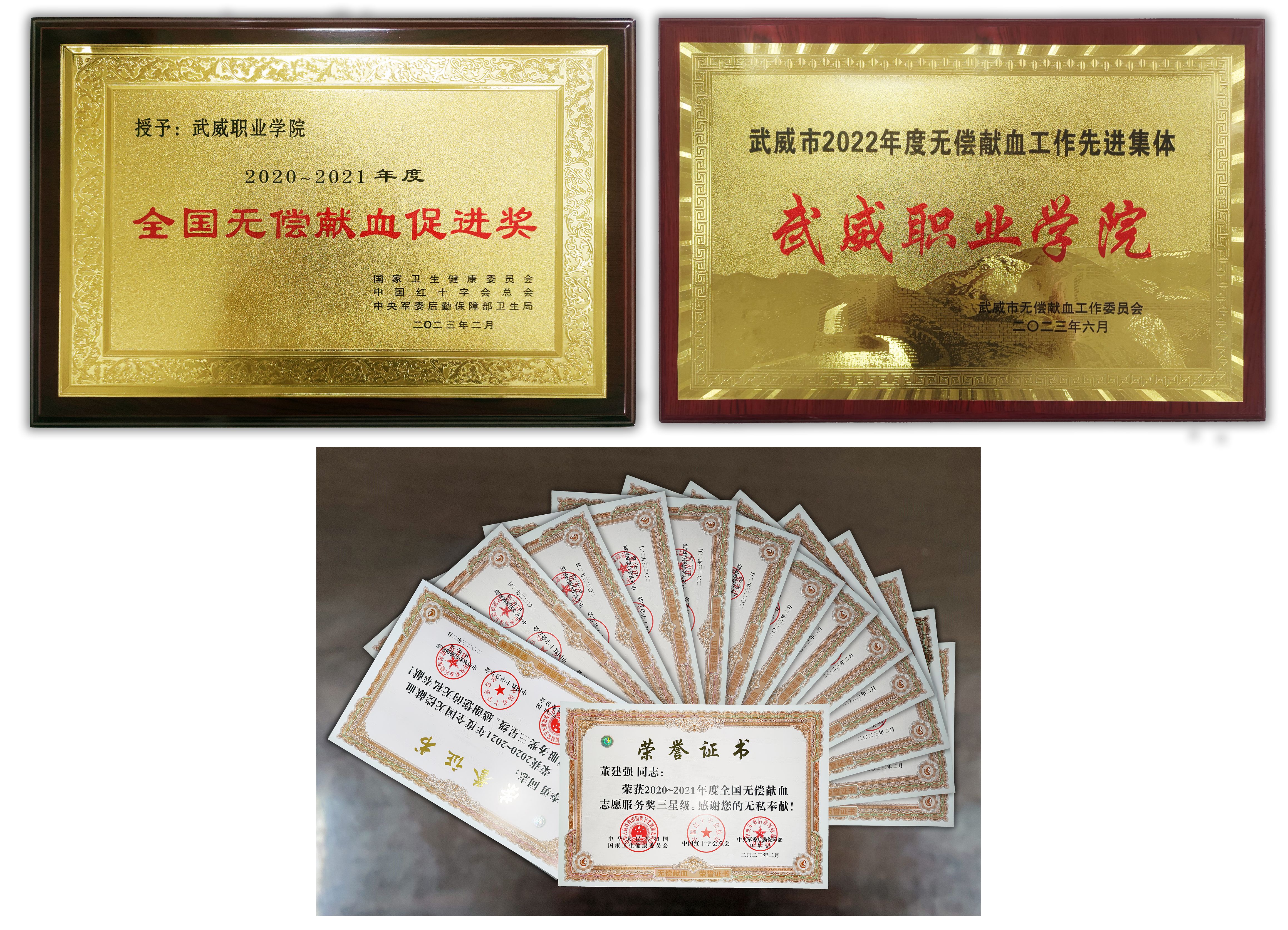 學(xué)校繼2020年獲得“2018-2019年度全國無償獻(xiàn)血促進(jìn)獎(jiǎng)”后,再次榮獲“2020-2021年度全國無償獻(xiàn)血促進(jìn)獎(jiǎng)”,14名師生榮獲全國無償獻(xiàn)血志愿服務(wù)獎(jiǎng)。我校護(hù)理學(xué)院被評(píng)為武威市2022年度無償獻(xiàn)血工作先進(jìn)集體,1名教師被評(píng)為先進(jìn)個(gè)人。