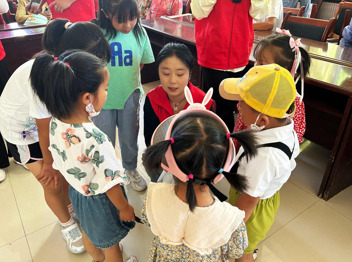圖為實(shí)踐隊員與走訪地兒童進(jìn)行普通話趣味游戲