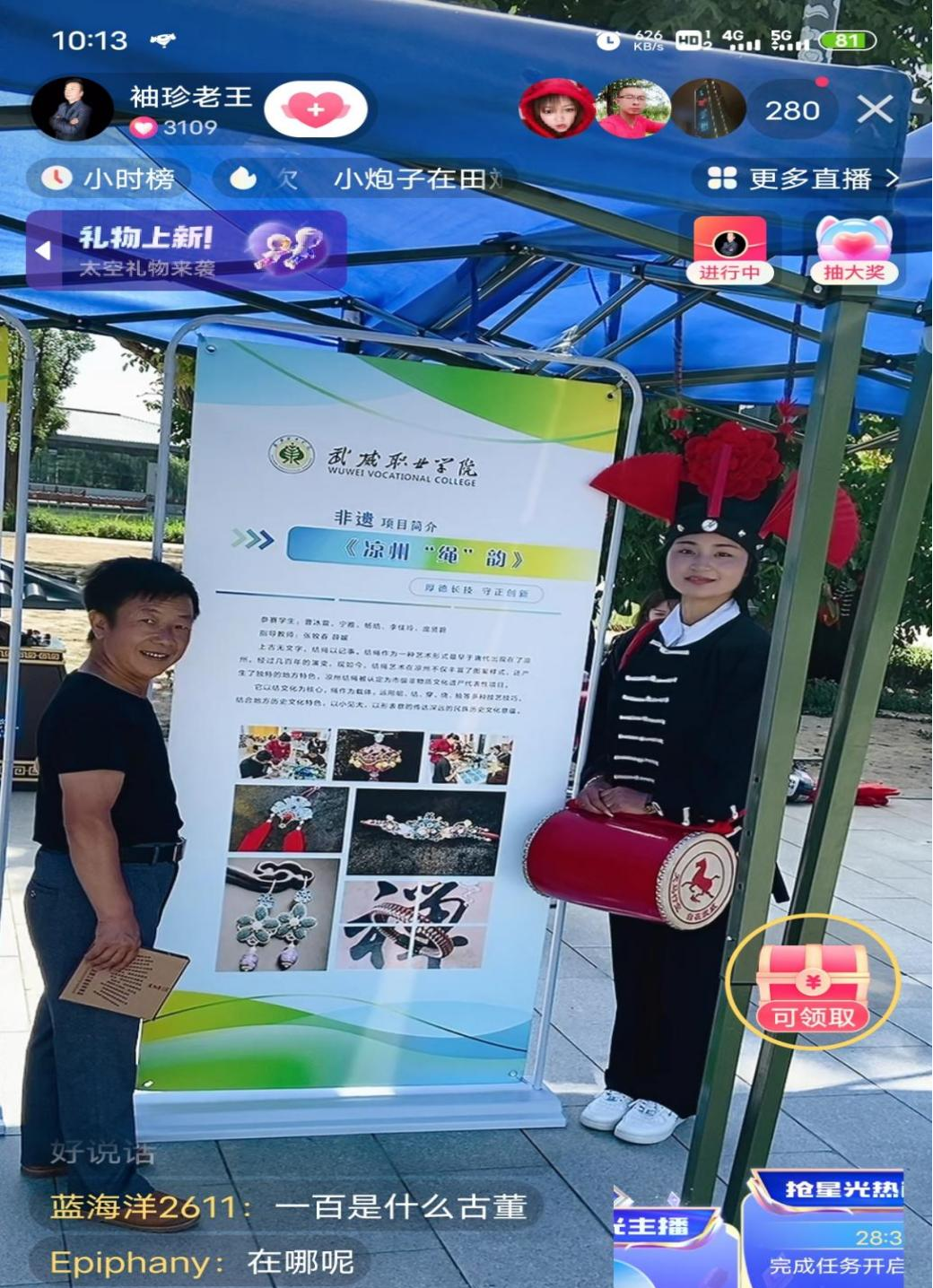 實(shí)踐團(tuán)在雷臺(tái)景區(qū)開展了涼州攻鼓子的展演活動(dòng),團(tuán)員們身著黑夸衣,頭戴黑幞帽,在炎炎夏日里向過往游客展示攻鼓子的魅力,過往游客深感震撼。此外,實(shí)踐團(tuán)成員通過文化展架以及文創(chuàng)產(chǎn)品的形式展示武威非遺文化,并邀請(qǐng)網(wǎng)絡(luò)達(dá)人以現(xiàn)場(chǎng)直播的形式擴(kuò)大宣傳范圍,以新媒體的形式讓更多的人關(guān)注武威非遺文化。通過現(xiàn)場(chǎng)展演以及新媒體宣傳,創(chuàng)新“活”的交流模式,在弦歌不輟、思接千載的傳承中,非遺文化的芬芳愈加醇厚。