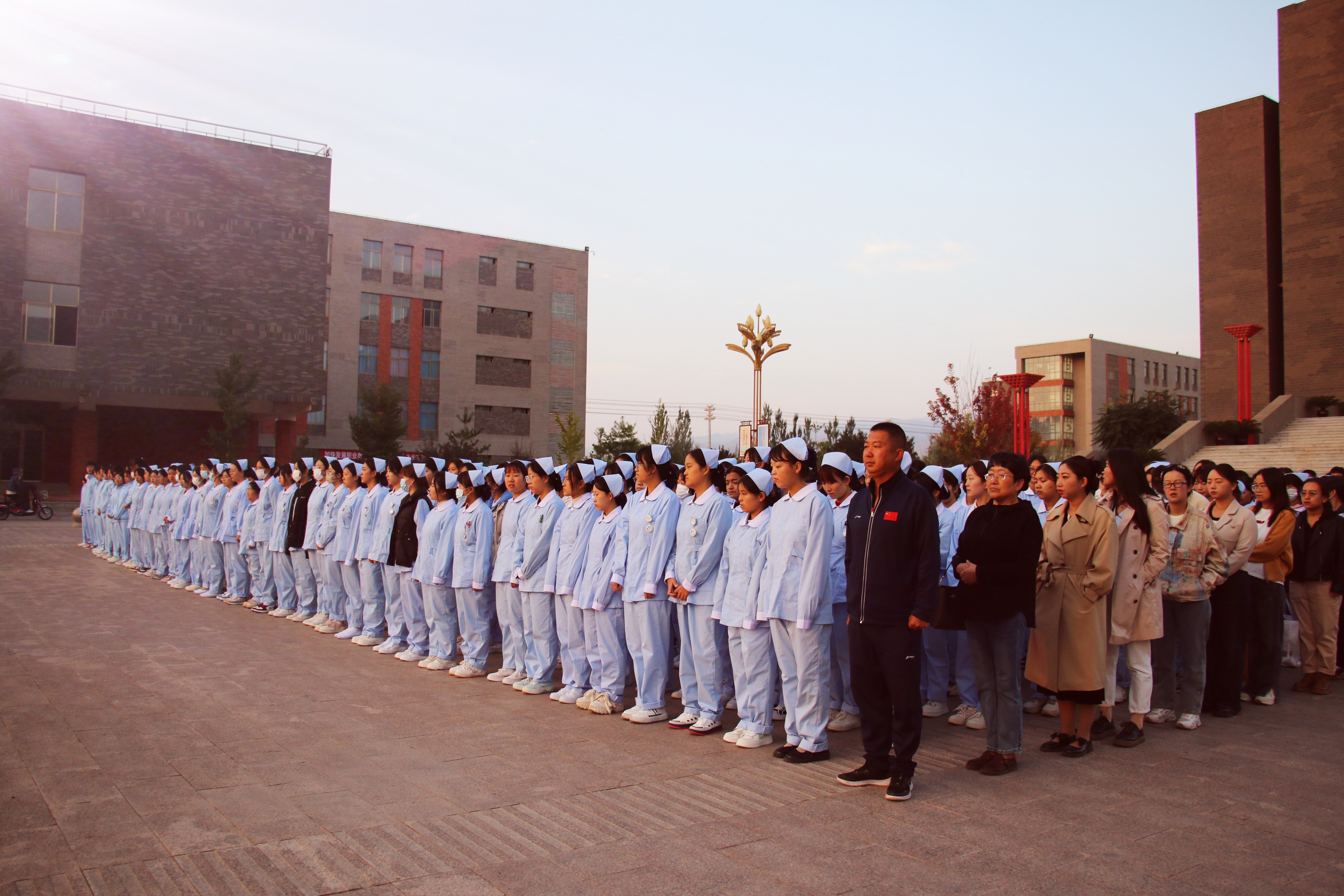 10月9日清晨,護理學院在圖書館前廣場舉行升國旗儀式,學院黨總支書記張建輝、團委書記楊杰、全體班主任及2022、2023級全體學生參加此次升旗儀式,儀式由楊杰主持。