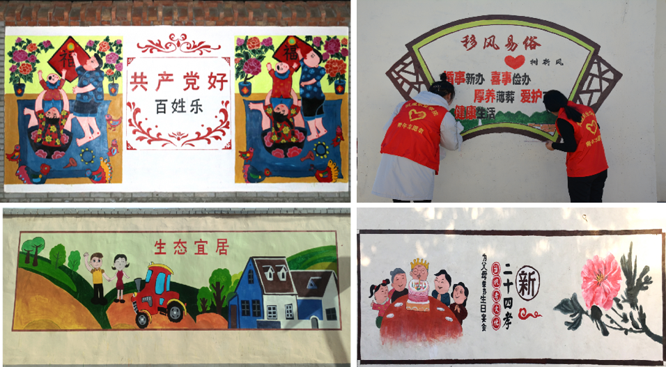 自2019 年以來,武威職業(yè)學(xué)院堅持“立足地方、融入地方、服務(wù)地方”的發(fā)展理念,將優(yōu)勢學(xué)科專業(yè)與武威市經(jīng)濟(jì)社會發(fā)展緊密結(jié)合,組織師生開展“打造人文美居助力鄉(xiāng)村振興”墻體彩繪志愿服務(wù)項目,通過墻體彩繪反映黨的領(lǐng)導(dǎo)下農(nóng)村精神風(fēng)貌的變化和取得的成就,將村莊重點街巷屋面墻體繪制出一幅幅反映美麗鄉(xiāng)村建設(shè)、社會主義核心價值觀、移風(fēng)易俗、鄉(xiāng)風(fēng)文明等為主題的墻體畫,形象生動、 通俗易懂的內(nèi)容讓村民變“被動學(xué)”為“主動看”,不僅展現(xiàn)了農(nóng)村新生活、農(nóng)業(yè)新氣象、農(nóng)民新面貌,美化了村容村貌,為美麗鄉(xiāng)村建設(shè)、人居環(huán)境美化添磚加瓦。