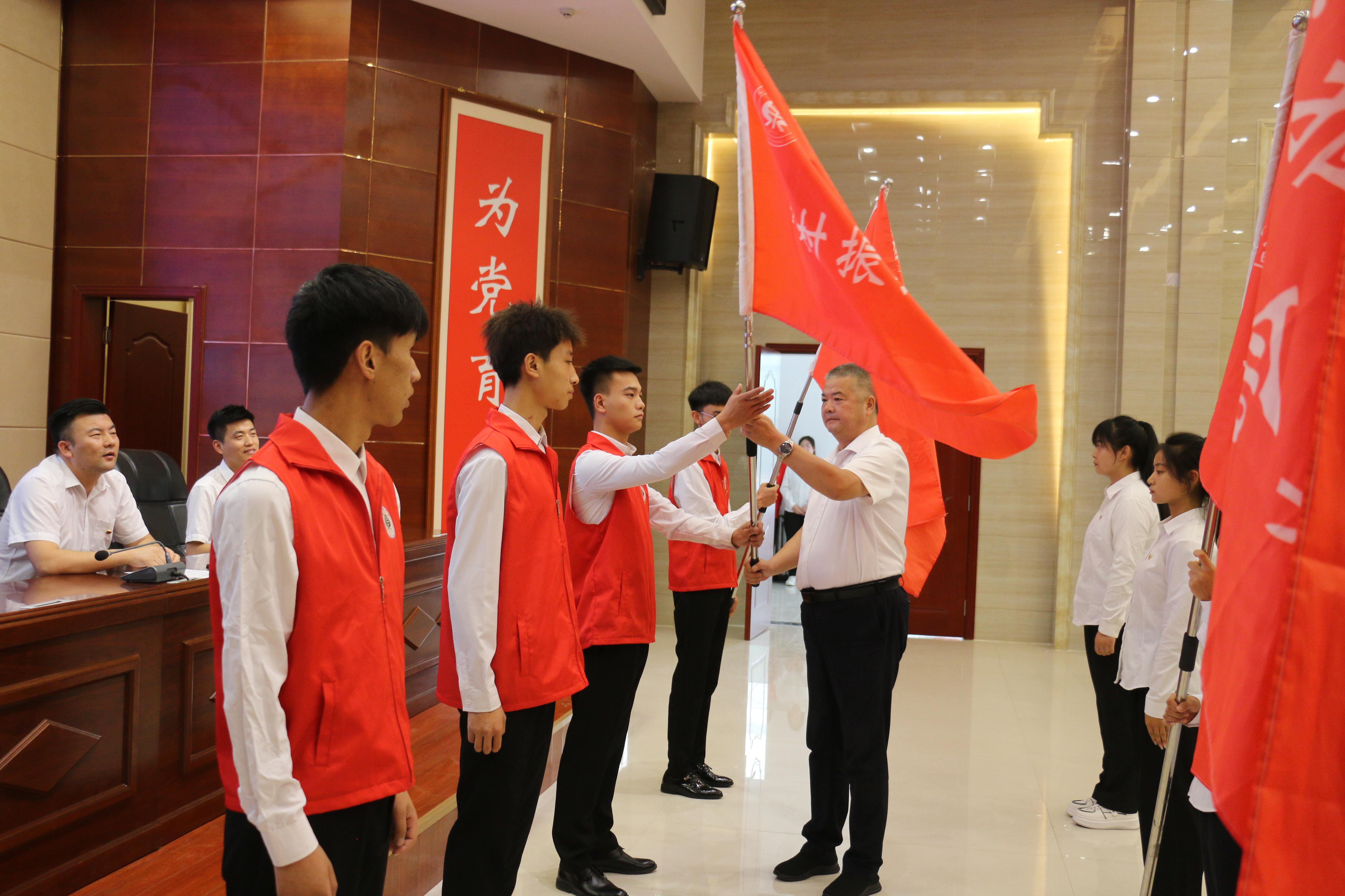 王守云為各實(shí)踐服務(wù)團(tuán)隊(duì)授旗。志愿者代表候昊燁代表全體隊(duì)員莊嚴(yán)承諾,遵守紀(jì)律,克服困難,團(tuán)結(jié)協(xié)作,全力以赴,力爭(zhēng)圓滿地完成預(yù)定的各項(xiàng)實(shí)踐任務(wù)。指導(dǎo)教師代表姚盈老師發(fā)言,介紹了“直播帶貨-非遺傳承”鄉(xiāng)村振興促進(jìn)團(tuán)的實(shí)踐計(jì)劃情況,號(hào)召老師和同學(xué)們深入基層一線,用腳步丈量祖國(guó)大地,用眼睛發(fā)現(xiàn)中國(guó)精神,用耳朵傾聽(tīng)人民呼聲,用內(nèi)心感應(yīng)時(shí)代脈搏。