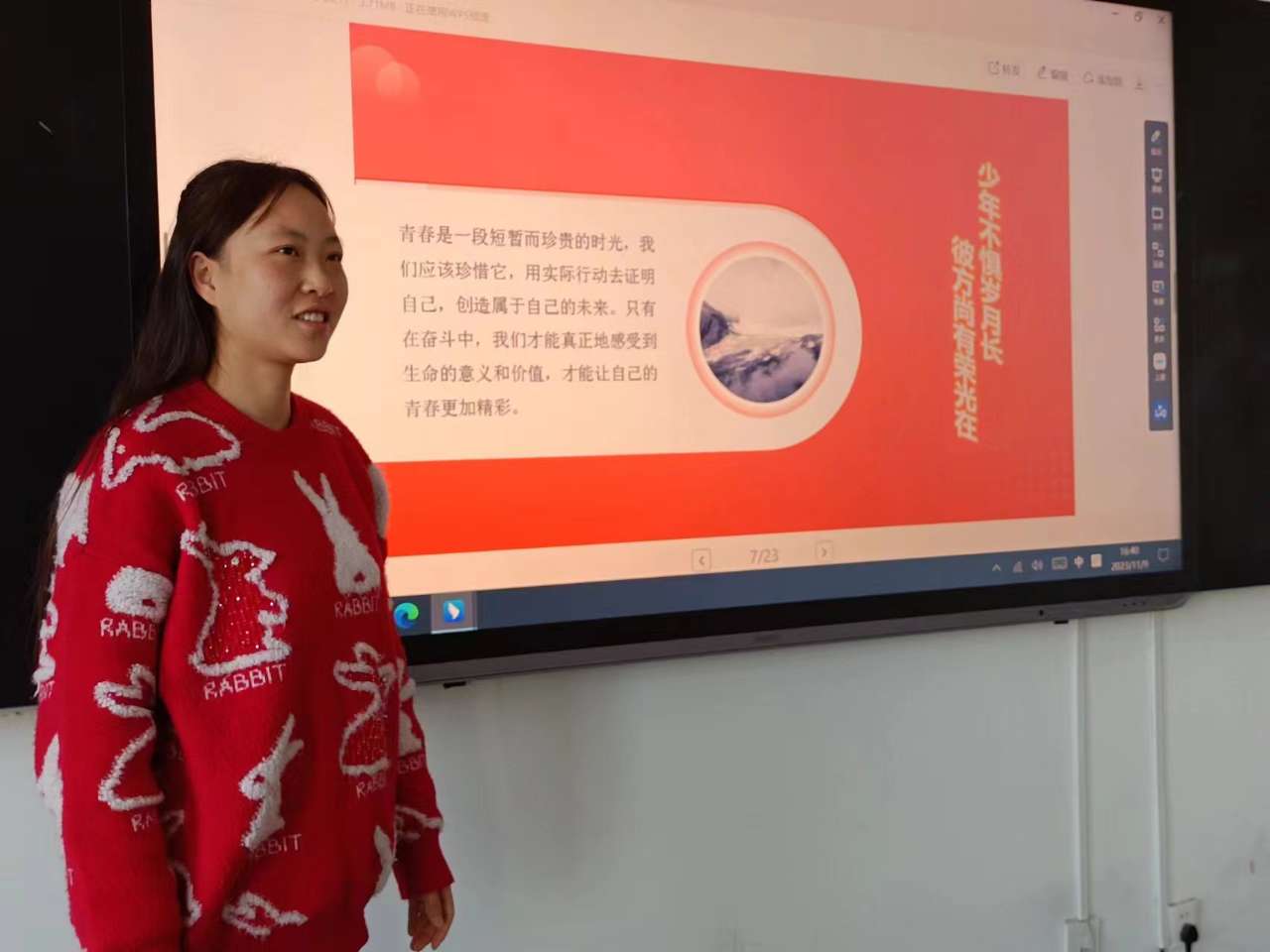 藝術與教育學院2021級學生后麗婷分享了自己參加“三下鄉(xiāng)”社會實踐服務團隊,走進基層社區(qū)開展志愿服務活動,在基層體悟中不斷增強責任感和使命感,在社會課堂中“受教育、長才干、作貢獻”的事跡。她期盼各位學子做新時代好青年,如螢火一般,有一分熱便發(fā)一分光,以奮斗來點亮青春最亮麗的底色。