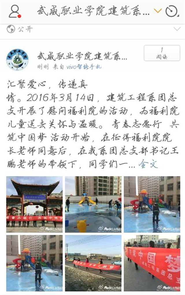 三是利用新媒體,開展“微公益”系列活動(dòng),在青年志愿者服務(wù)月活動(dòng)中,積極利用微信、微博等宣傳主陣地發(fā)布、傳播志愿服務(wù)活動(dòng),增強(qiáng)青年志愿服務(wù)活動(dòng)對(duì)青年學(xué)生的吸引力和感召力,進(jìn)一步提升我系活動(dòng)影響力。