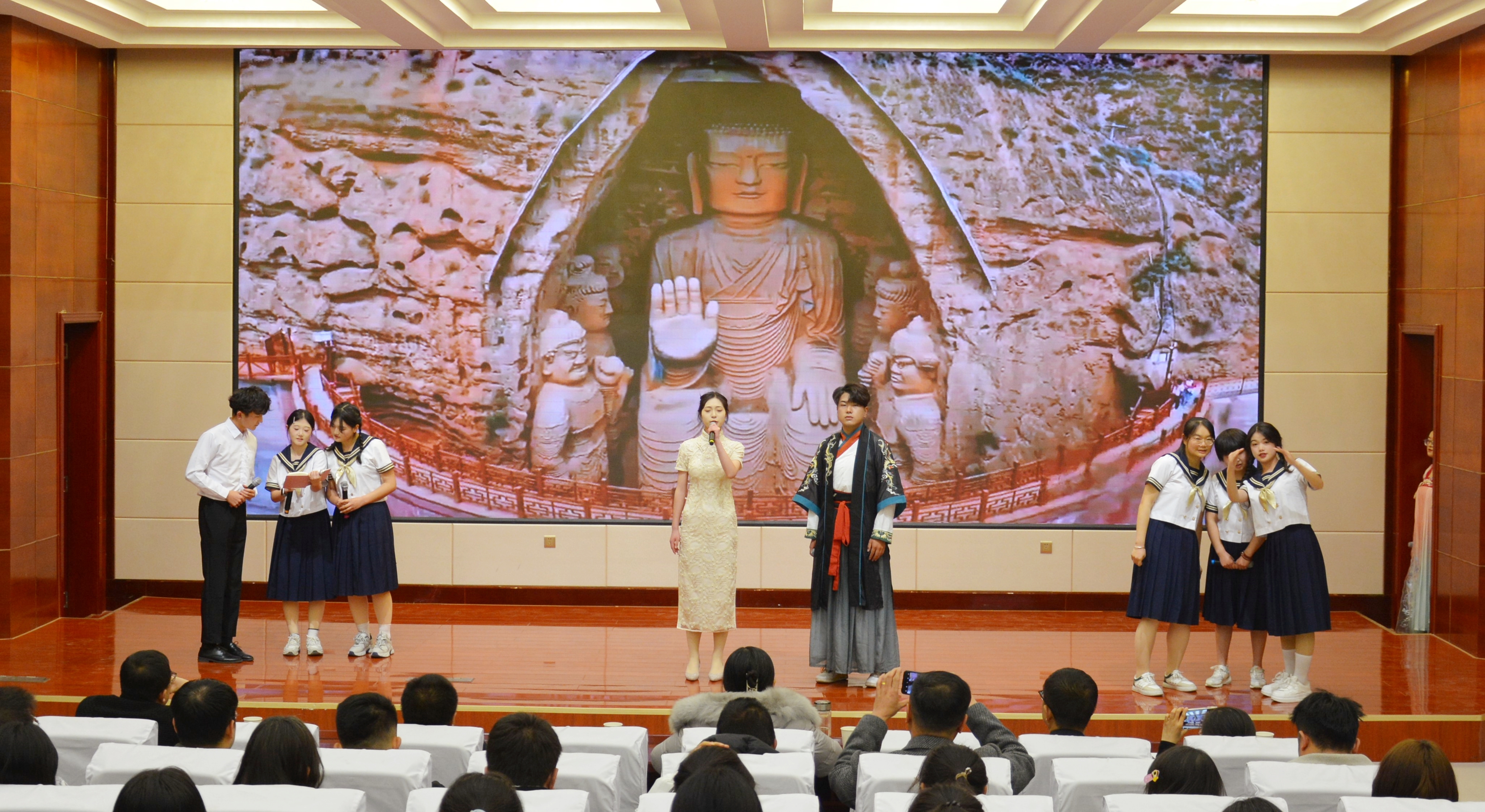 比賽現(xiàn)場精彩紛呈,現(xiàn)場氣氛異常熱烈,掌聲此起彼伏。節(jié)目以詩歌吟誦、伴舞、書法、國畫、武術、情景表演等豐富多彩的藝術形式,為現(xiàn)場觀眾打造出一場別開生面的涼州文化視聽盛宴。同學們激情洋溢,用澎湃真摯的情感演繹著經典燦爛的磅礴詩篇,用跨越千年的對話勾勒出雄渾壯烈的漢武雄風,用鏗鏘有力的旋律編織出蕩氣回腸的時代頌歌,以青春奮斗的初心賡續(xù)著生生不息的五涼文化。