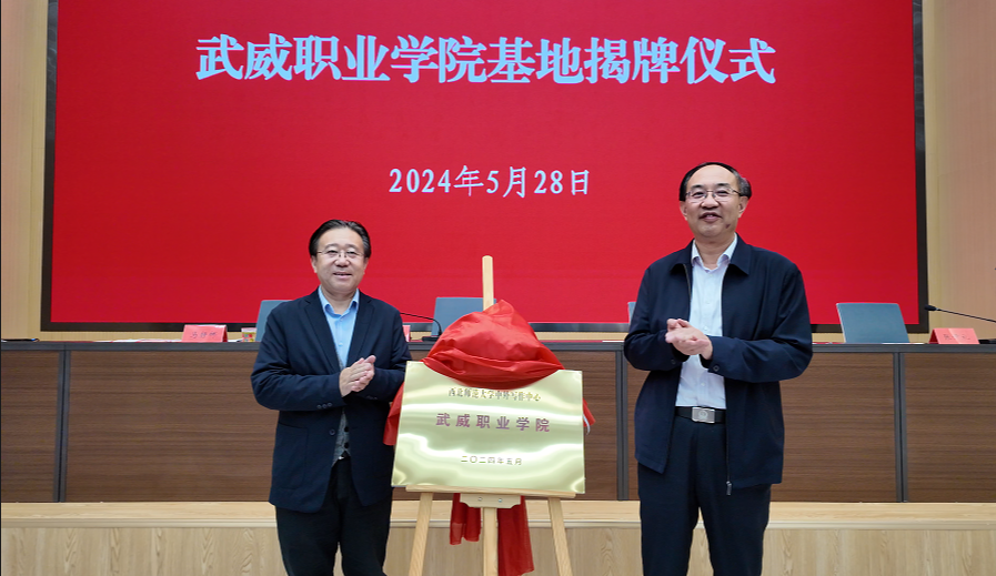 西北師范大學中外寫作中心常務副主任徐兆壽和武威職業(yè)學院黨委書記王宏為“西北師范大學中外寫作中心武威職業(yè)學院”基地揭牌。中國日報社甘肅記者站站長馬靜娜為基地贈送《中國日報》,武威職業(yè)學院黨委委員、副校長田迎春代表學校受贈。