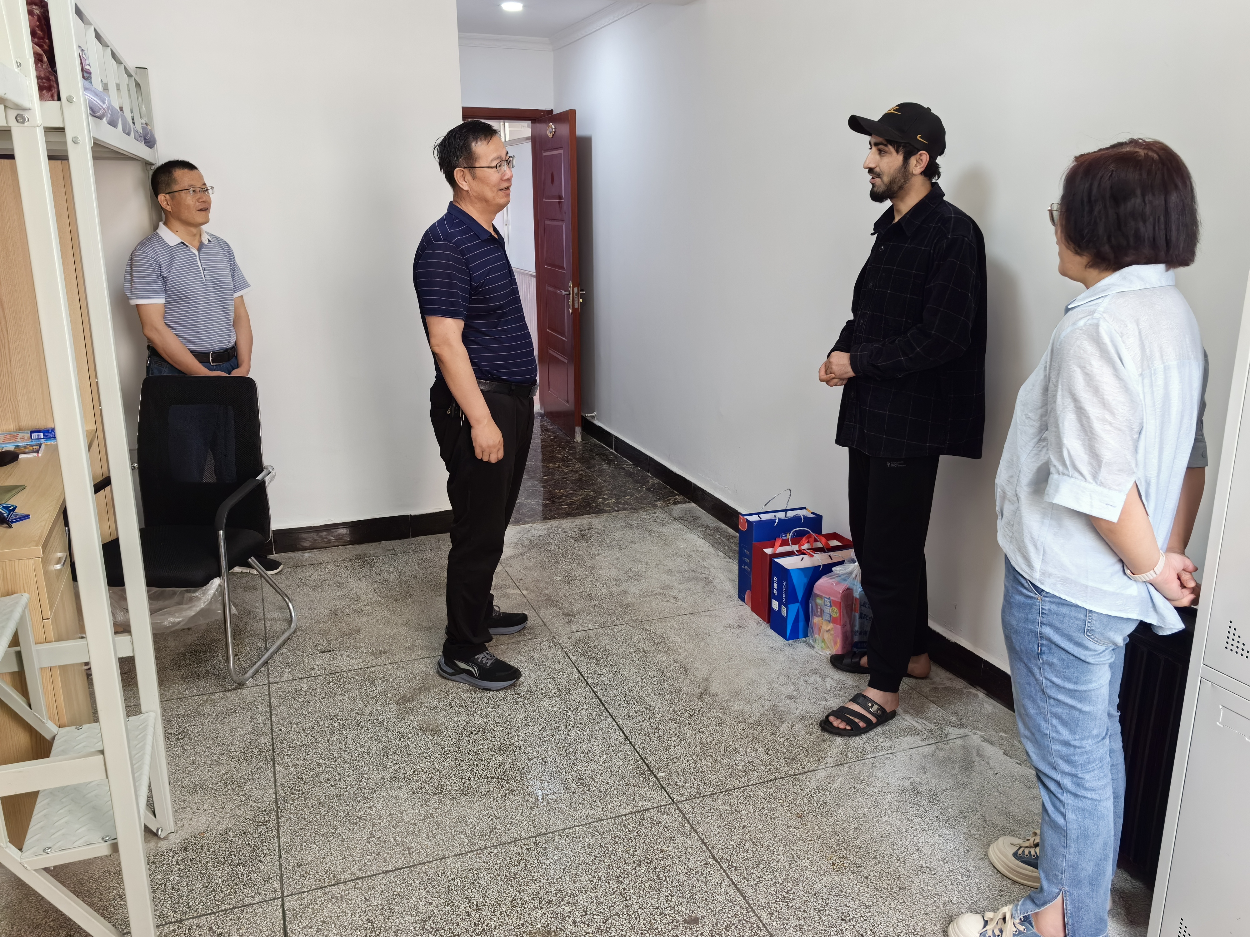 張開(kāi)禮深入留學(xué)生宿舍、廚房,查看了解留學(xué)生住宿、生活情況,并代表學(xué)校黨委向留學(xué)生表達(dá)了節(jié)日的慰問(wèn)和良好的祝愿,向留學(xué)生送上慰問(wèn)品。在留學(xué)生公寓,張開(kāi)禮與留學(xué)生親切交談,關(guān)切詢(xún)問(wèn)留學(xué)生日常生活、專(zhuān)業(yè)學(xué)習(xí)、課程實(shí)訓(xùn)、畢業(yè)就業(yè)等情況。他鼓勵(lì)留學(xué)生們努力學(xué)習(xí),養(yǎng)成良好生活習(xí)慣,遵守公寓管理規(guī)則和安全條例,保持良好生活環(huán)境,同時(shí)也提醒留學(xué)生們端午節(jié)放假期間,不論是外出還是在校,都要注意安全,遵守法律法規(guī)和校紀(jì)校規(guī)。