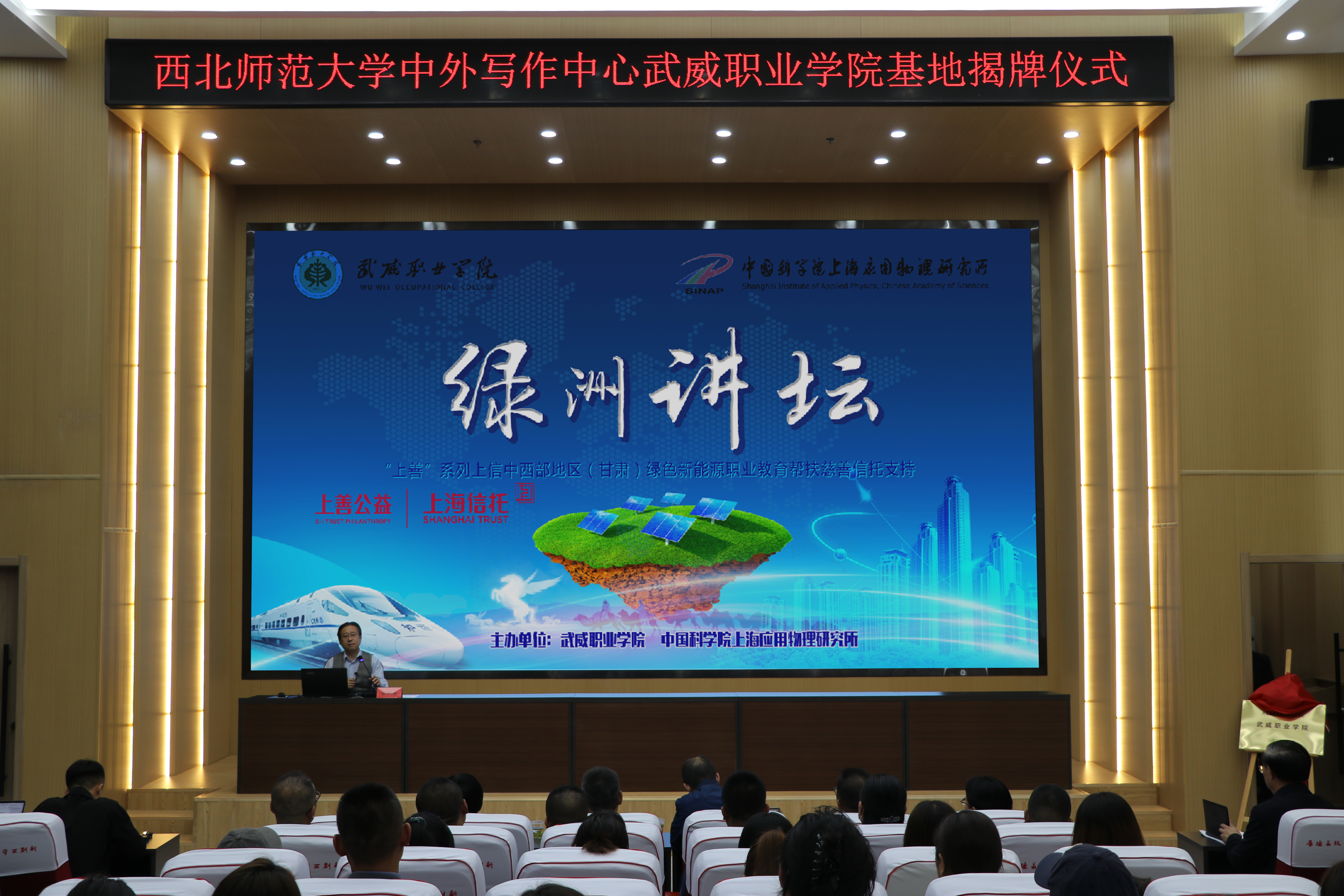 5月28日下午,西北師范大學(xué)中外寫作中心武威職業(yè)學(xué)院基地揭牌儀式暨報(bào)告會(huì)在武威職業(yè)學(xué)院能源科技樓一樓學(xué)術(shù)報(bào)告廳隆重舉行。