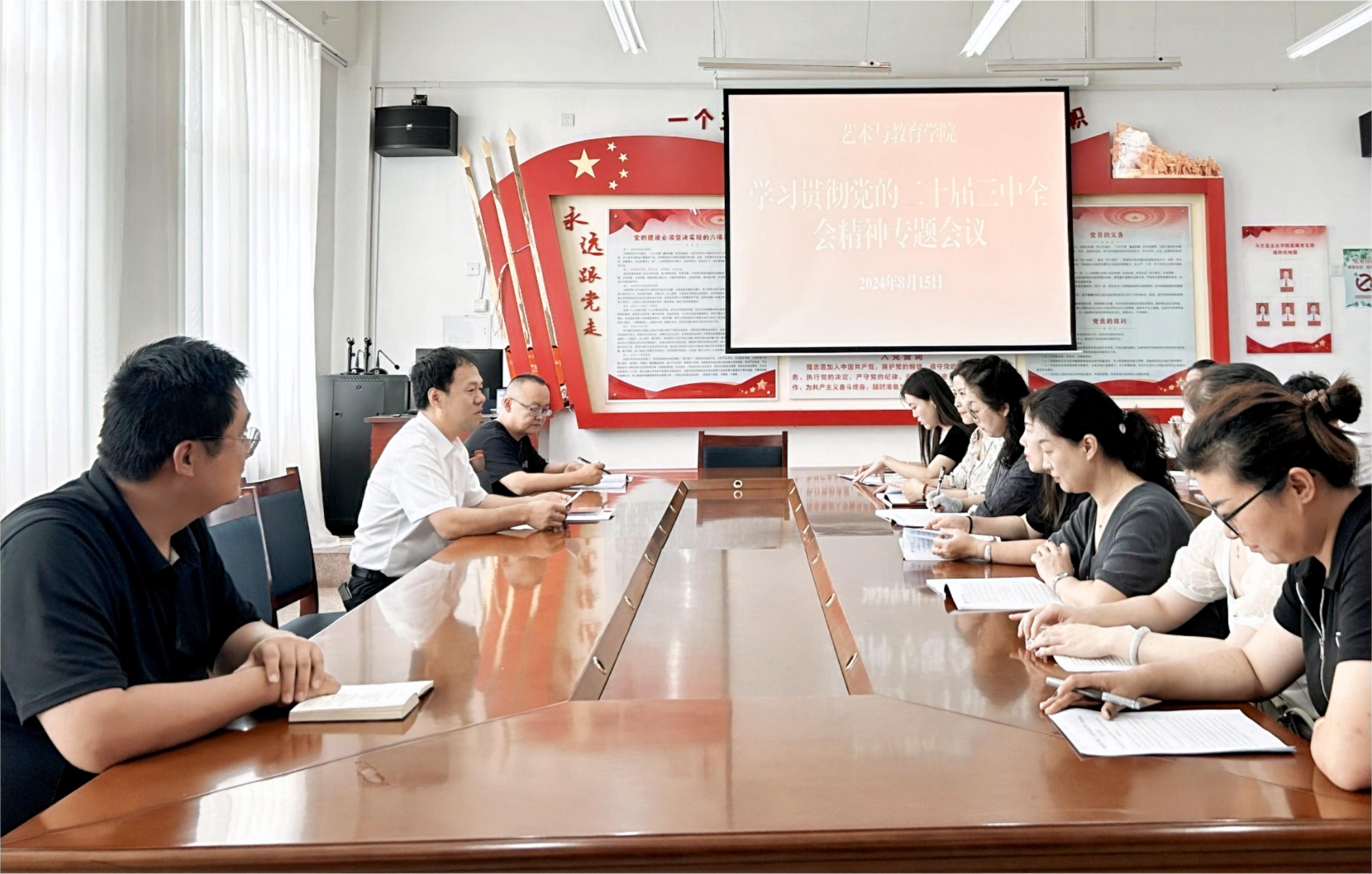 8月15日,藝術(shù)與教育學(xué)院召開(kāi)黨的二十屆三中全會(huì)精神專題學(xué)習(xí)會(huì)議,傳達(dá)學(xué)習(xí)《習(xí)近平總書(shū)記關(guān)于<中共中央關(guān)于進(jìn)一步全面深化改革、推進(jìn)中國(guó)式現(xiàn)代化的決定>的說(shuō)明》《中國(guó)共產(chǎn)黨第二十屆中央委員會(huì)第三次全體會(huì)議公報(bào)》《中共中央關(guān)于進(jìn)一步全面深化改革推進(jìn)中國(guó)式現(xiàn)代化的決定》,以及《深化教育綜合改革》等內(nèi)容。會(huì)議由學(xué)院黨總支書(shū)記王政主持,全體教職工參加會(huì)議。