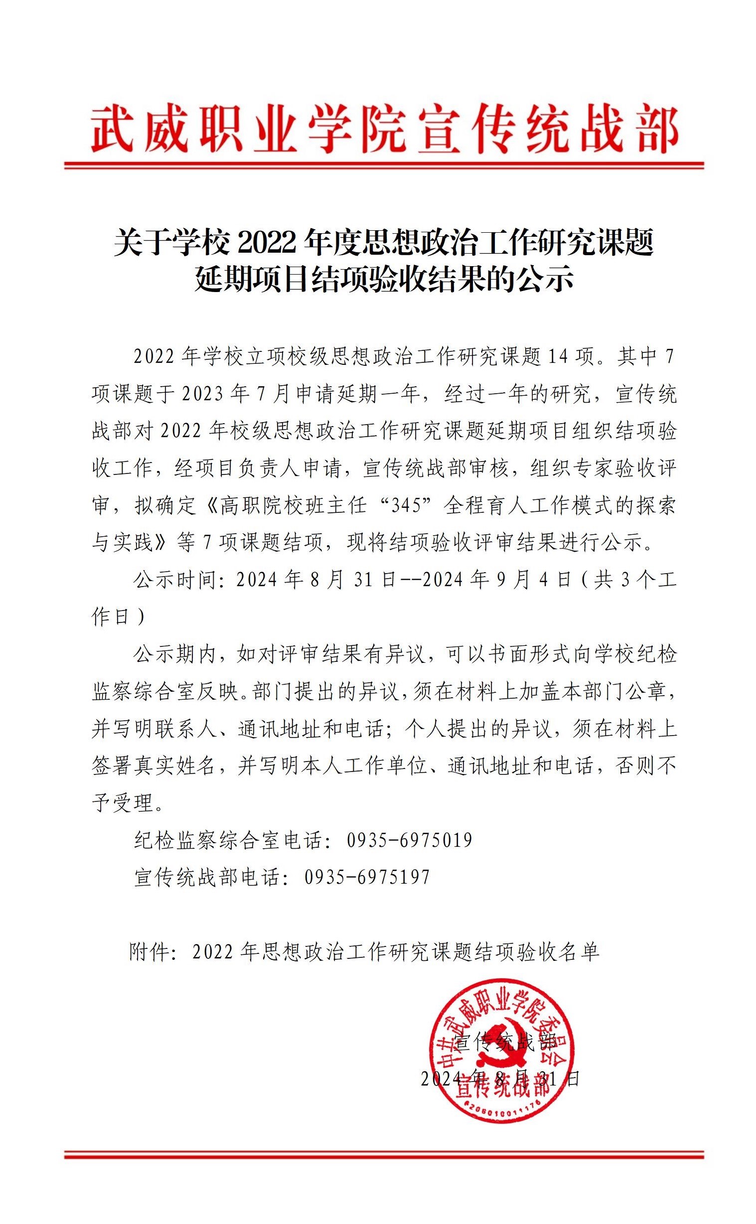 關于學校2022年度思想政治工作研究課題延期項目結項驗收結果的公示