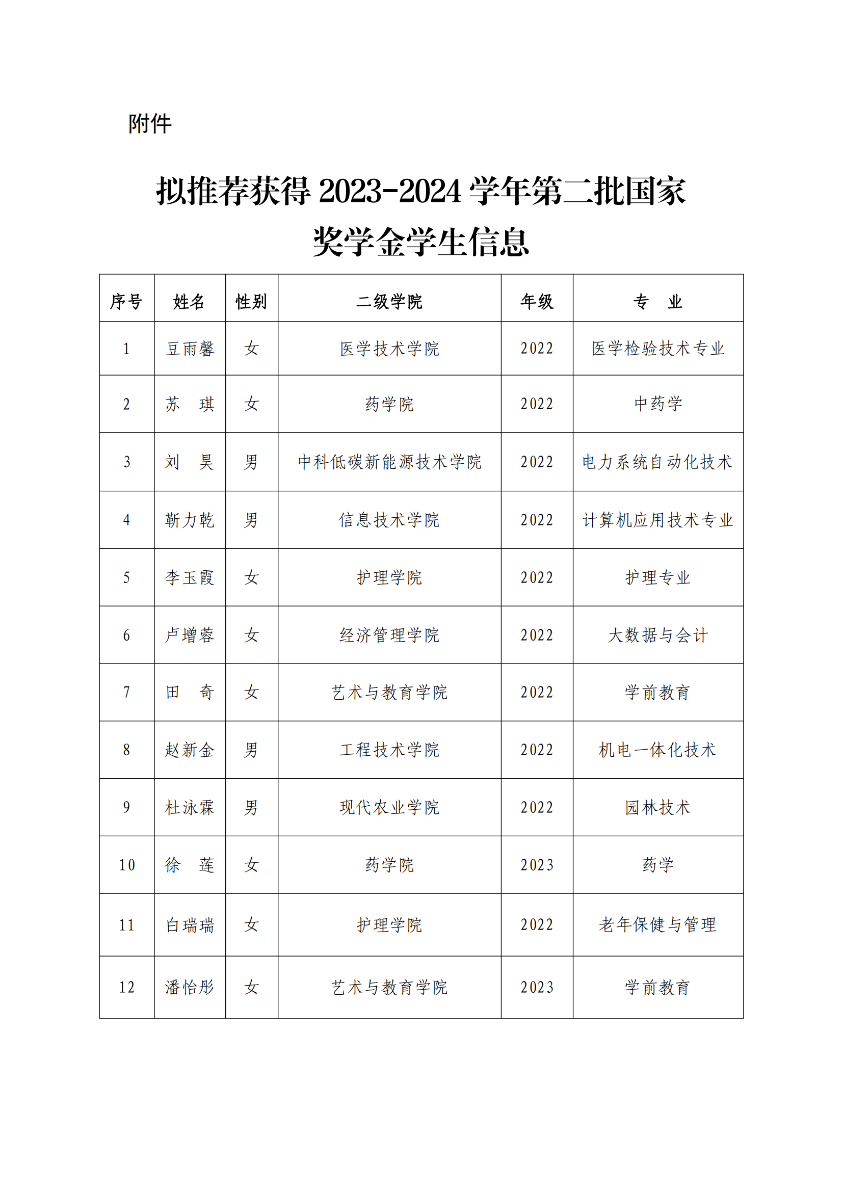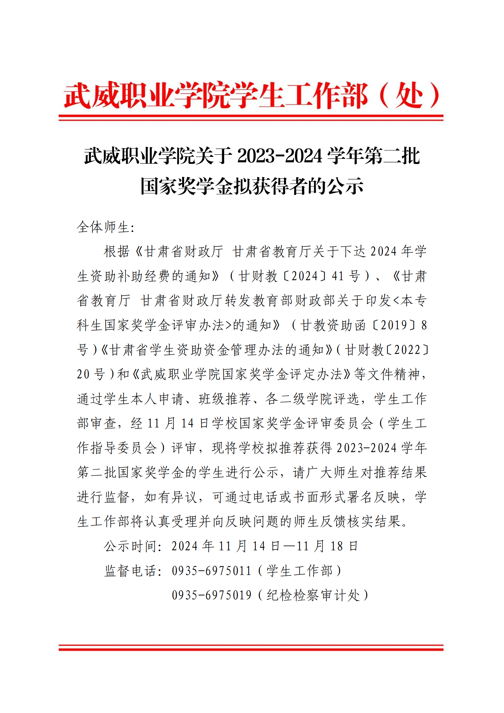 武威職業(yè)學(xué)院關(guān)于2023-2024學(xué)年第二批國家獎學(xué)金擬獲得者的公示