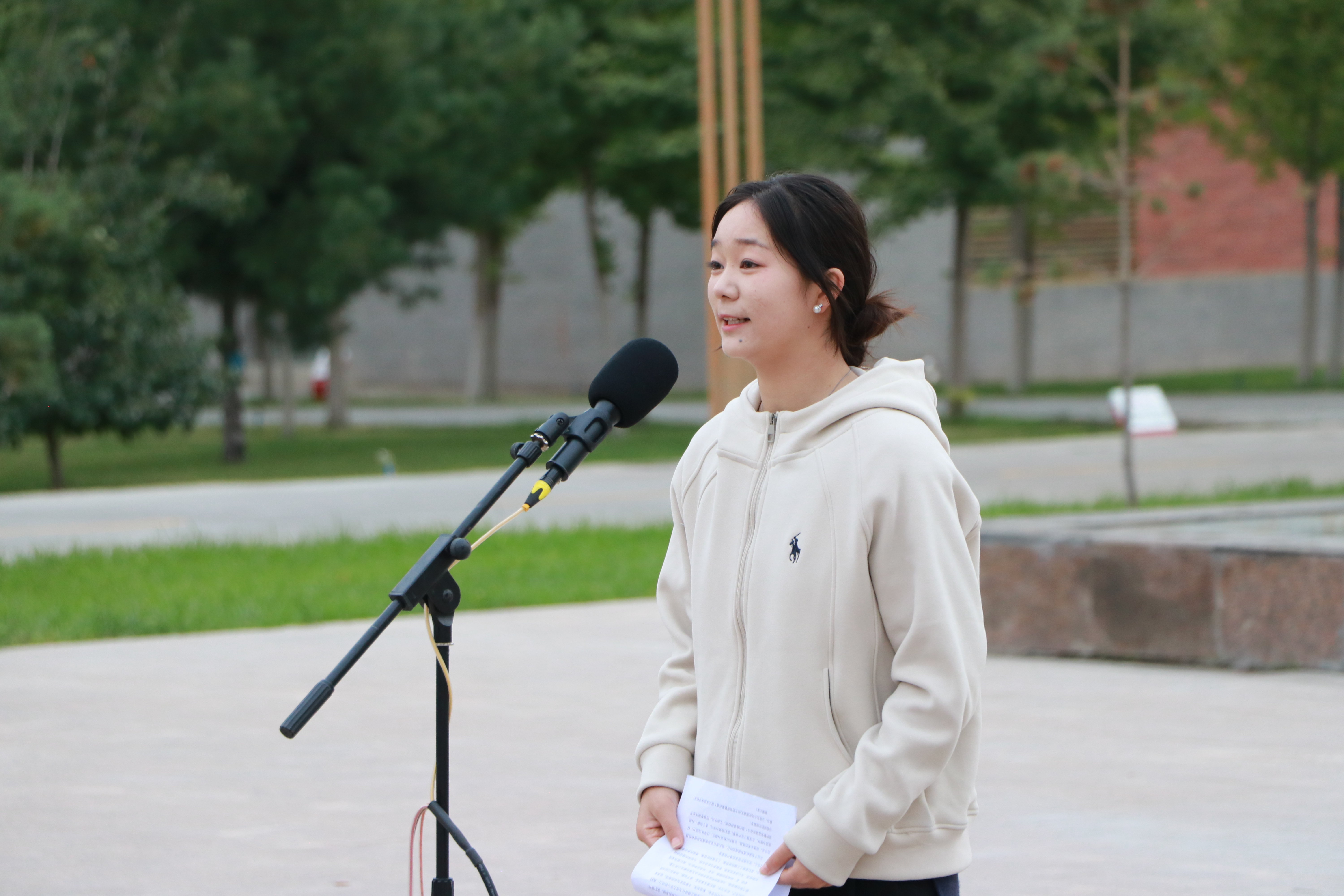 優(yōu)秀學(xué)生代表、藝術(shù)與教育學(xué)院2023級(jí)學(xué)前教育專(zhuān)業(yè)的馬青妍同學(xué)進(jìn)行了國(guó)旗下的演講,她的演講激勵(lì)著在場(chǎng)的每一個(gè)人,表達(dá)了對(duì)祖國(guó)的熱愛(ài)和對(duì)未來(lái)的期許。