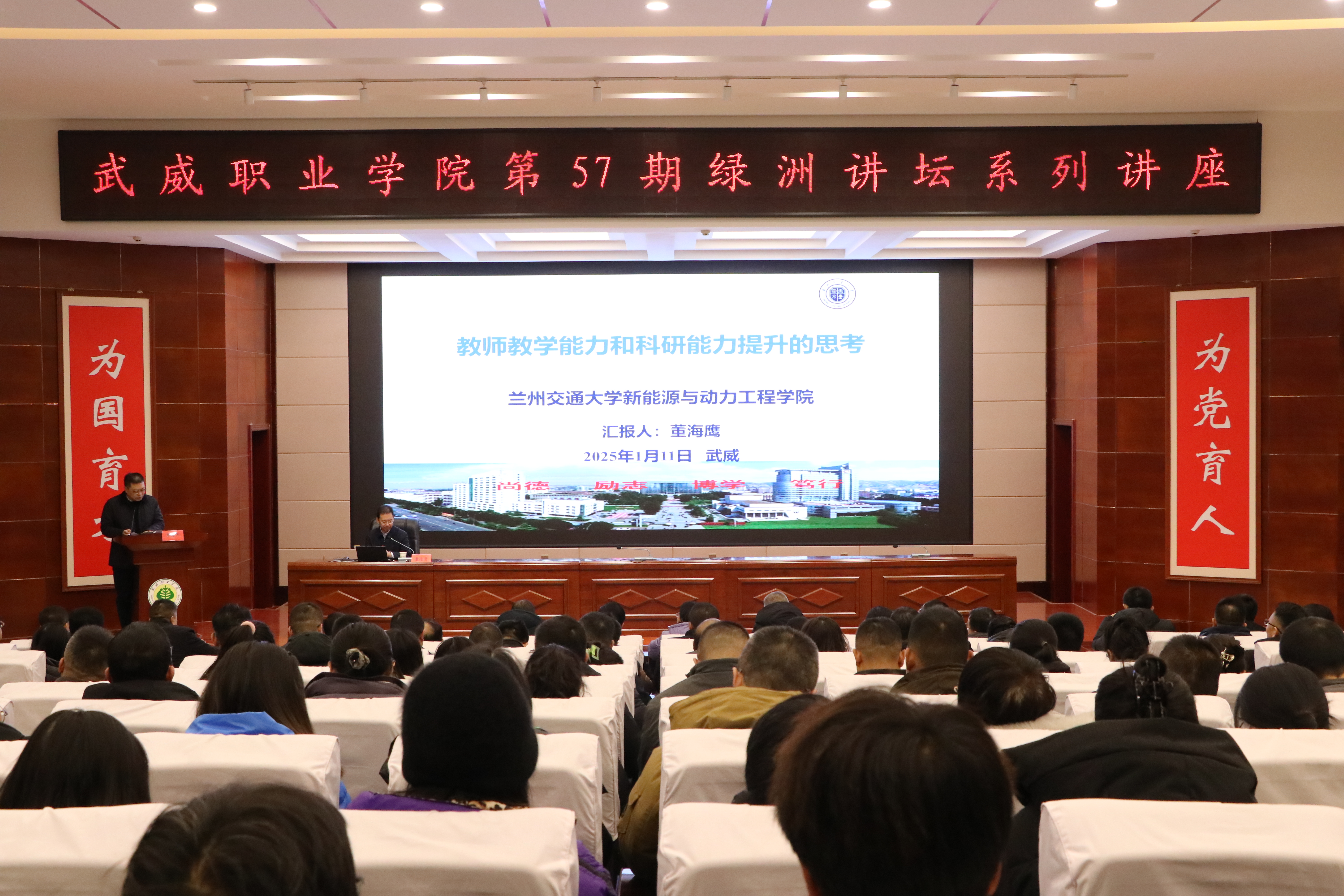 1月11日上午,學校特邀蘭州交通大學博士生導師董海鷹教授在菁英廳作了“教師教學能力和科研能力提升的思考”主題講座。講座由學校校長李海軍主持,學校領導、中層管理干部、教研室主任及教師代表共210余人參加。