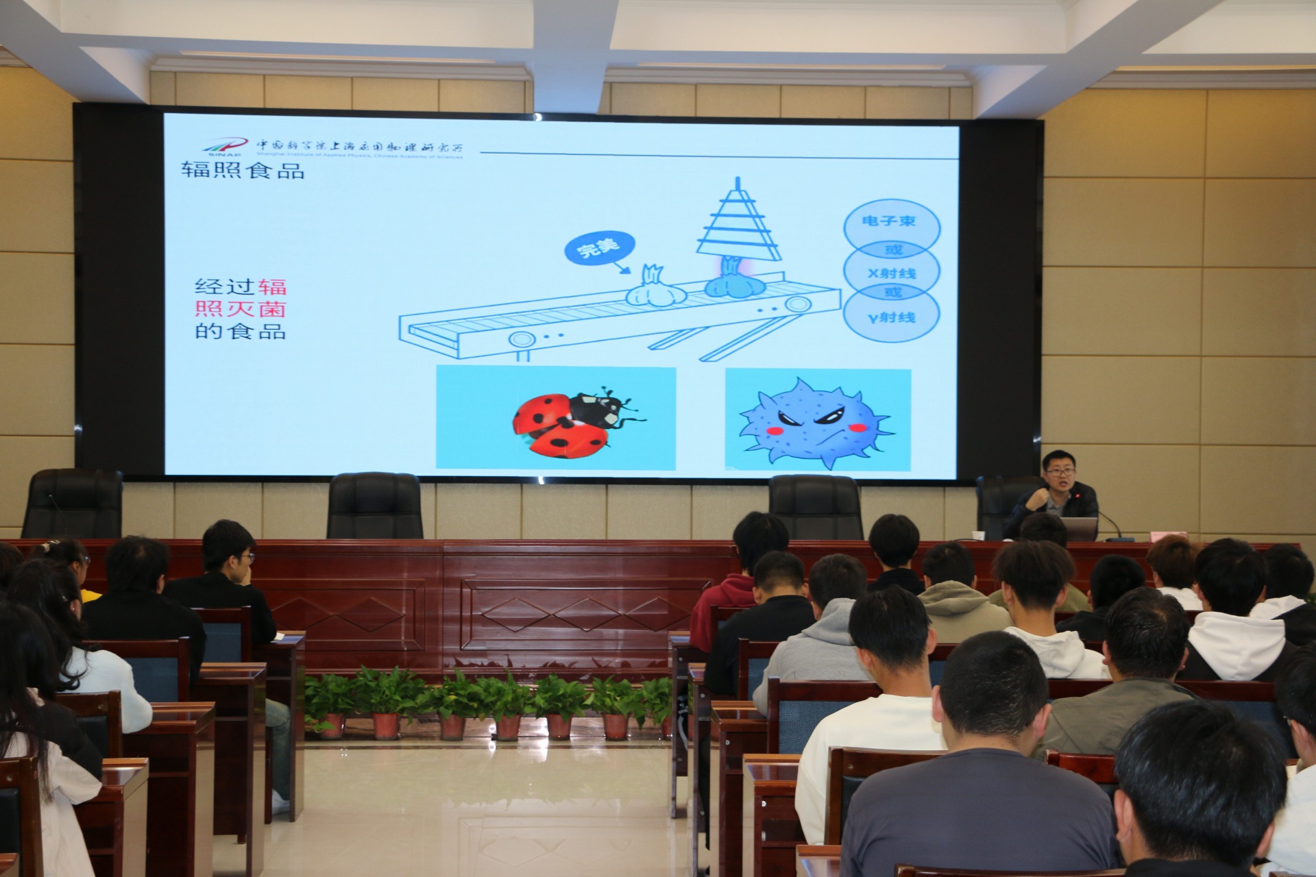李吉豪做了題為《身入“輻”境,洞悉其益——輻照技術(shù),點(diǎn)亮生活之光》的報(bào)告,從輻射技術(shù)概述科普、輻照技術(shù)在農(nóng)業(yè)領(lǐng)域的應(yīng)用、輻照技術(shù)在高分子化工領(lǐng)域的應(yīng)用等三個(gè)方面對(duì)輻照技術(shù)的前沿應(yīng)用進(jìn)行了生動(dòng)的講解,現(xiàn)場(chǎng)師生大受裨益,也讓學(xué)生對(duì)自己所學(xué)相關(guān)專業(yè)有了更加深刻的理解,同時(shí)激發(fā)了同學(xué)們對(duì)專業(yè)知識(shí)的學(xué)習(xí)熱情。