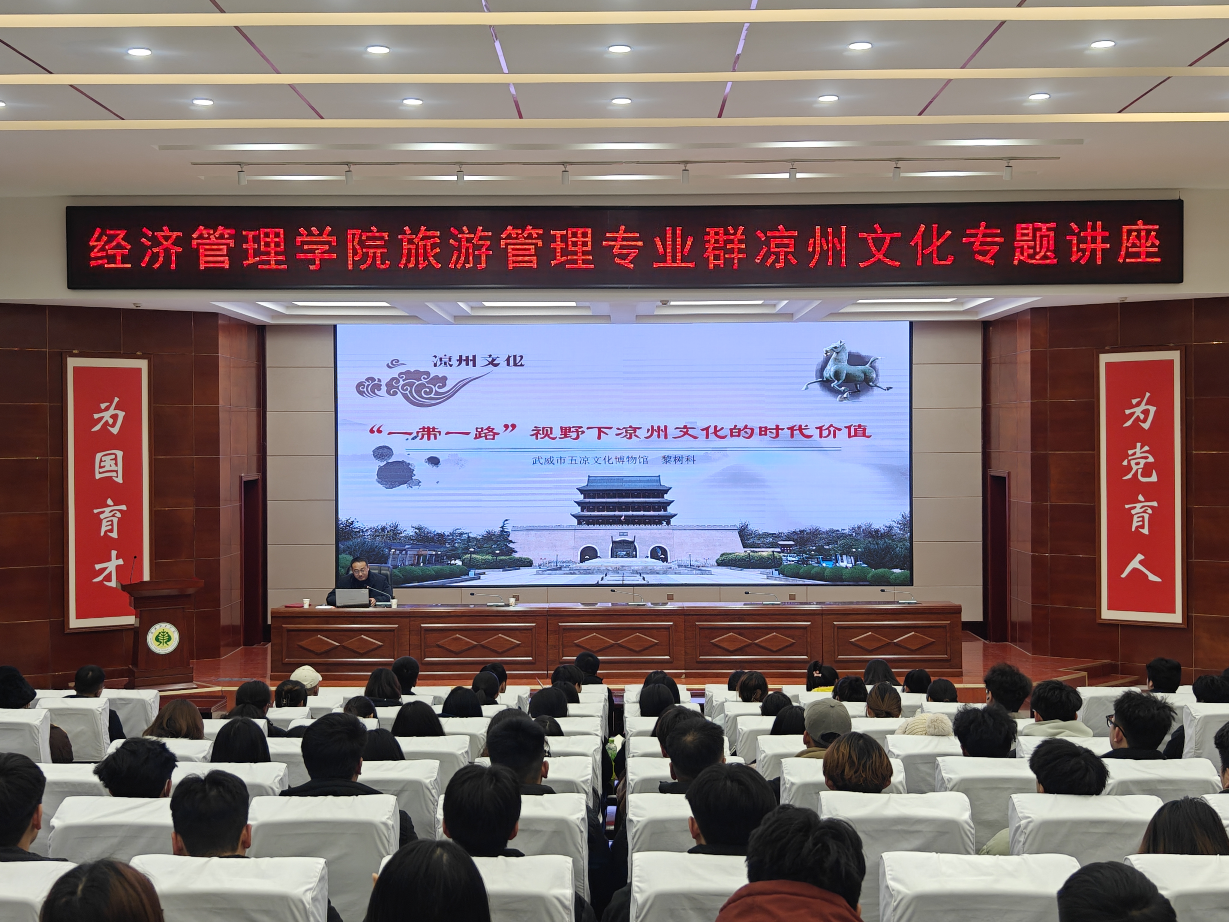 12月11日下午,經(jīng)濟(jì)管理學(xué)院邀請(qǐng)武威市五涼文化博物館館長(zhǎng)黎樹科開展了以《“一帶一路” 視野下涼州文化的時(shí)代價(jià)值》為主題的講座,旨在深入貫徹文化傳承發(fā)展戰(zhàn)略,加強(qiáng)傳統(tǒng)文化的弘揚(yáng)與教育。學(xué)院近200名師生參加此次講座。